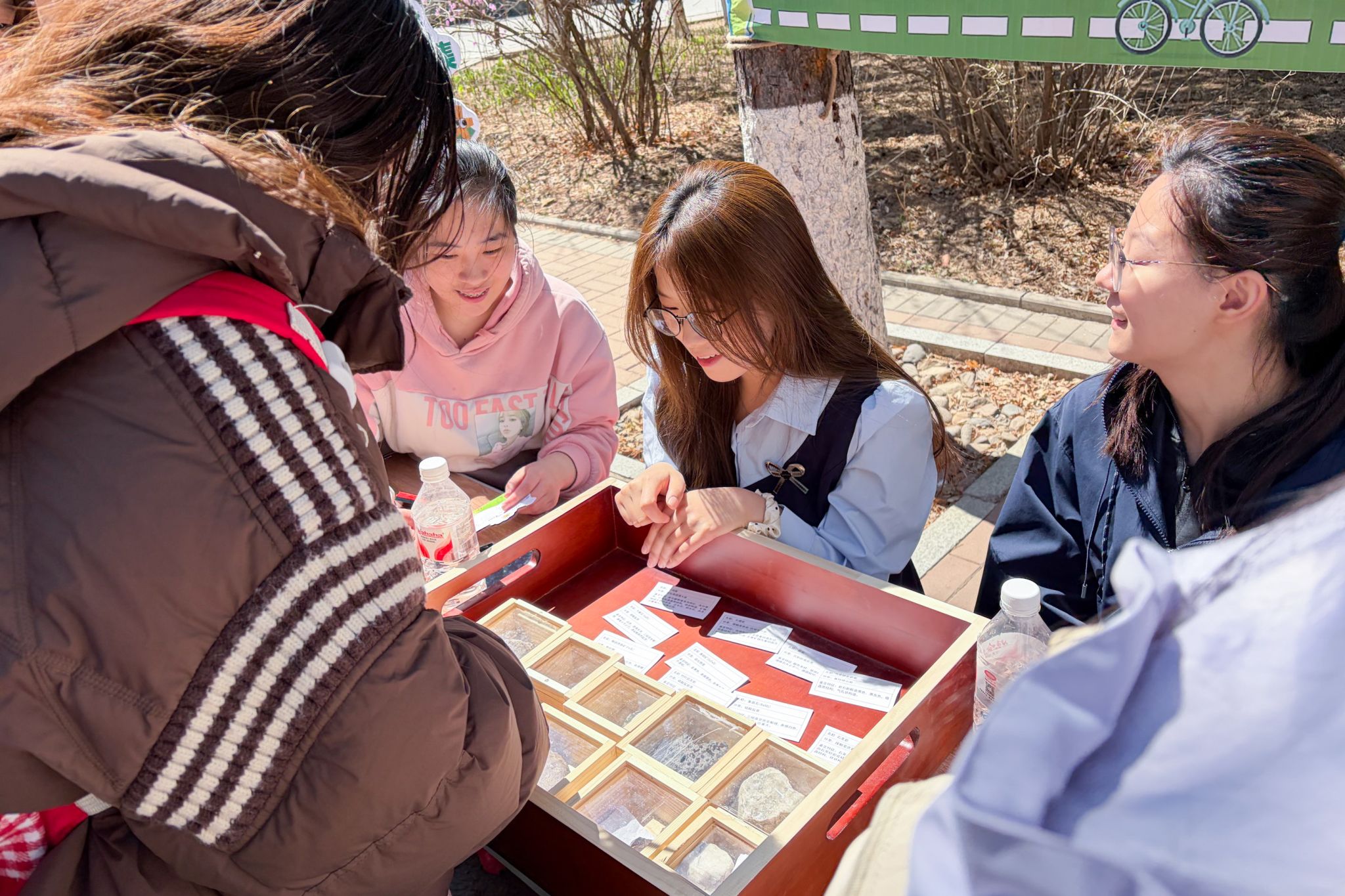 第二届“源动未来,循环市集”热闹开市。师生们携带闲置书籍、生活用品、学习用具等前来交换,让旧物在循环中重获新生,有效减少了资源浪费。“玩转地球”校园科普活动同步开展,围绕“珍爱自然资源 守护美丽中国”主题,特设“岩语知趣·地质探宝”“故土寻脉·家乡土壤印记”“万物相链·生态拼图”三大互动板块。同学们触摸辨识岩石矿物,在中国土壤分布图上标注家乡土壤印记,用动植物卡牌搭建生态链,在集章打卡的趣味体验中解锁地质、土壤、生态地理知识,践行绿色环保行动。