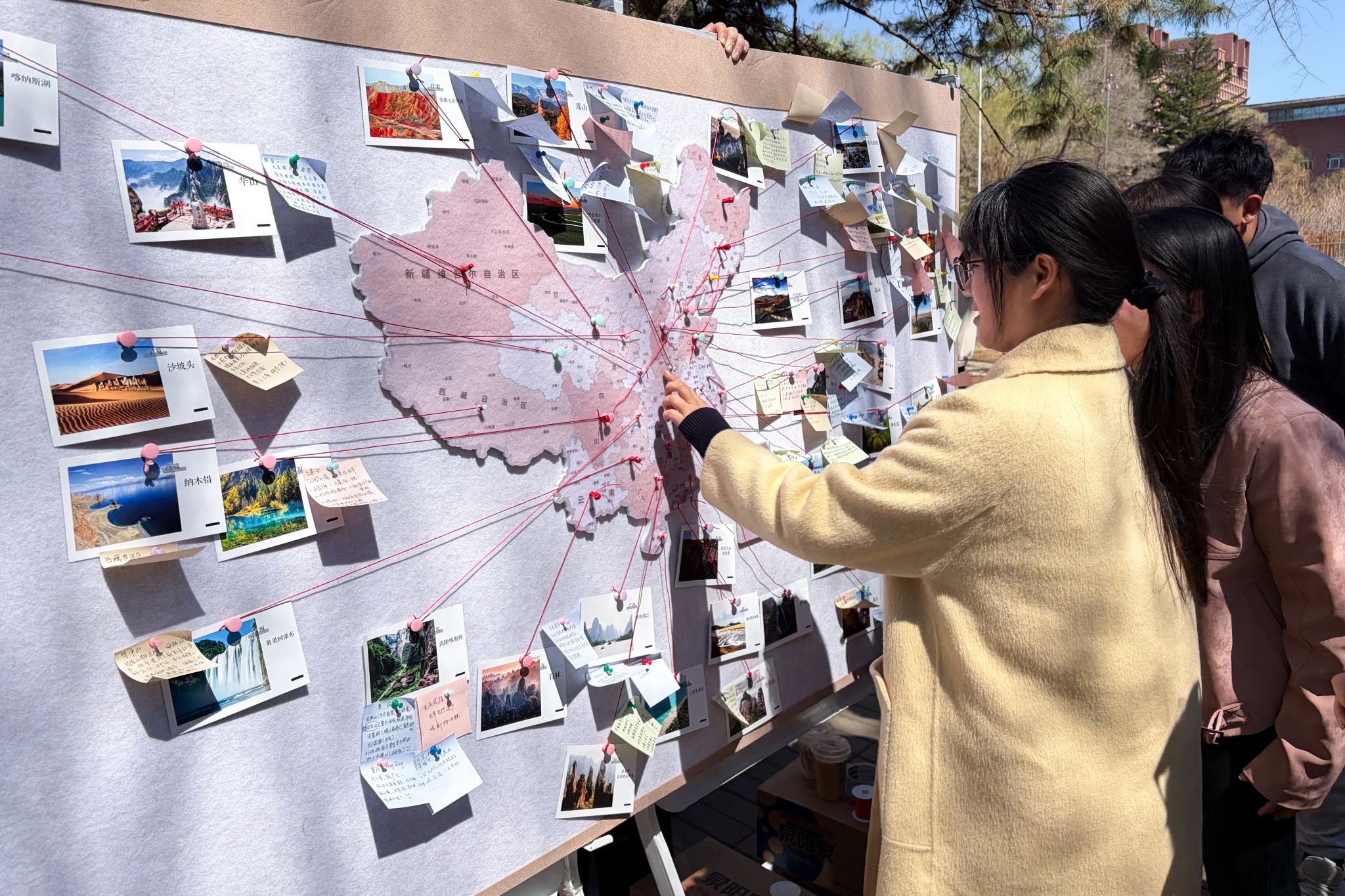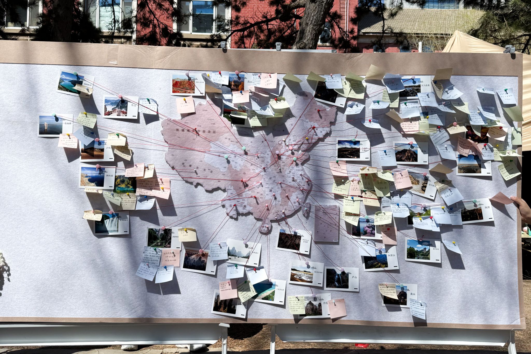 “一刻自然·露营漫游站”设置在地理楼南草地露营区,不但为师生打造了一方静谧的自然天地,还进行了地理景观的地图贴图展示。现场邀请同学们在准备好的中国地图上,对应标注各地特色自然地理景观,在便利贴上撰写一段家乡的自然地理景观介绍,粘贴到对应省份的景观旁,领取精美小礼品。活动引导同学们深入了解各地自然地理风貌,增强对家乡自然环境的认同感与自豪感,促进不同地域文化间的交流互鉴。