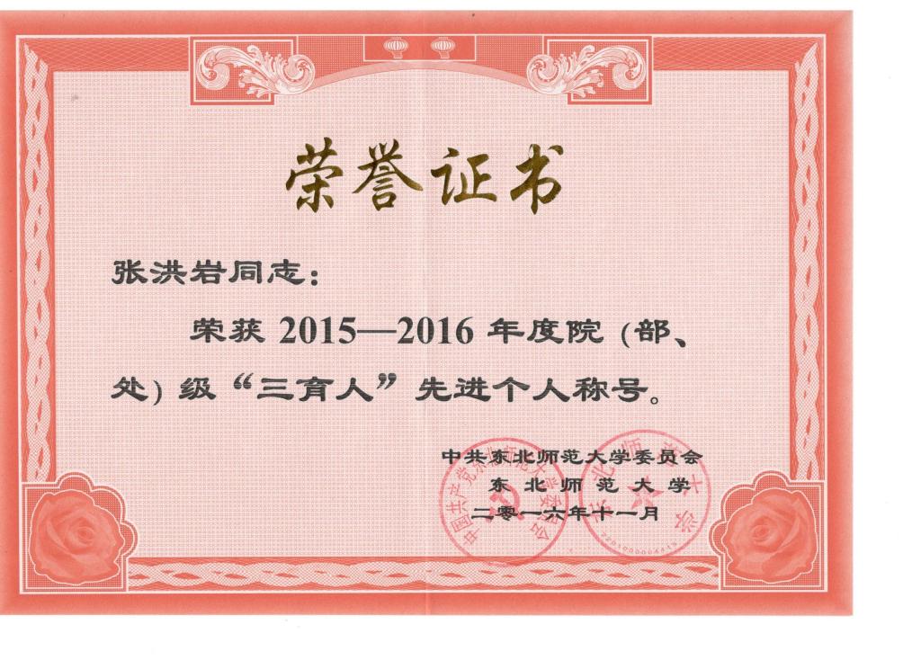 近日,我院张洪岩教授在学校组织的2015-2016年“三育人”评选工作中,荣获学校度院(部、处)级“三育人”先进个人称号。