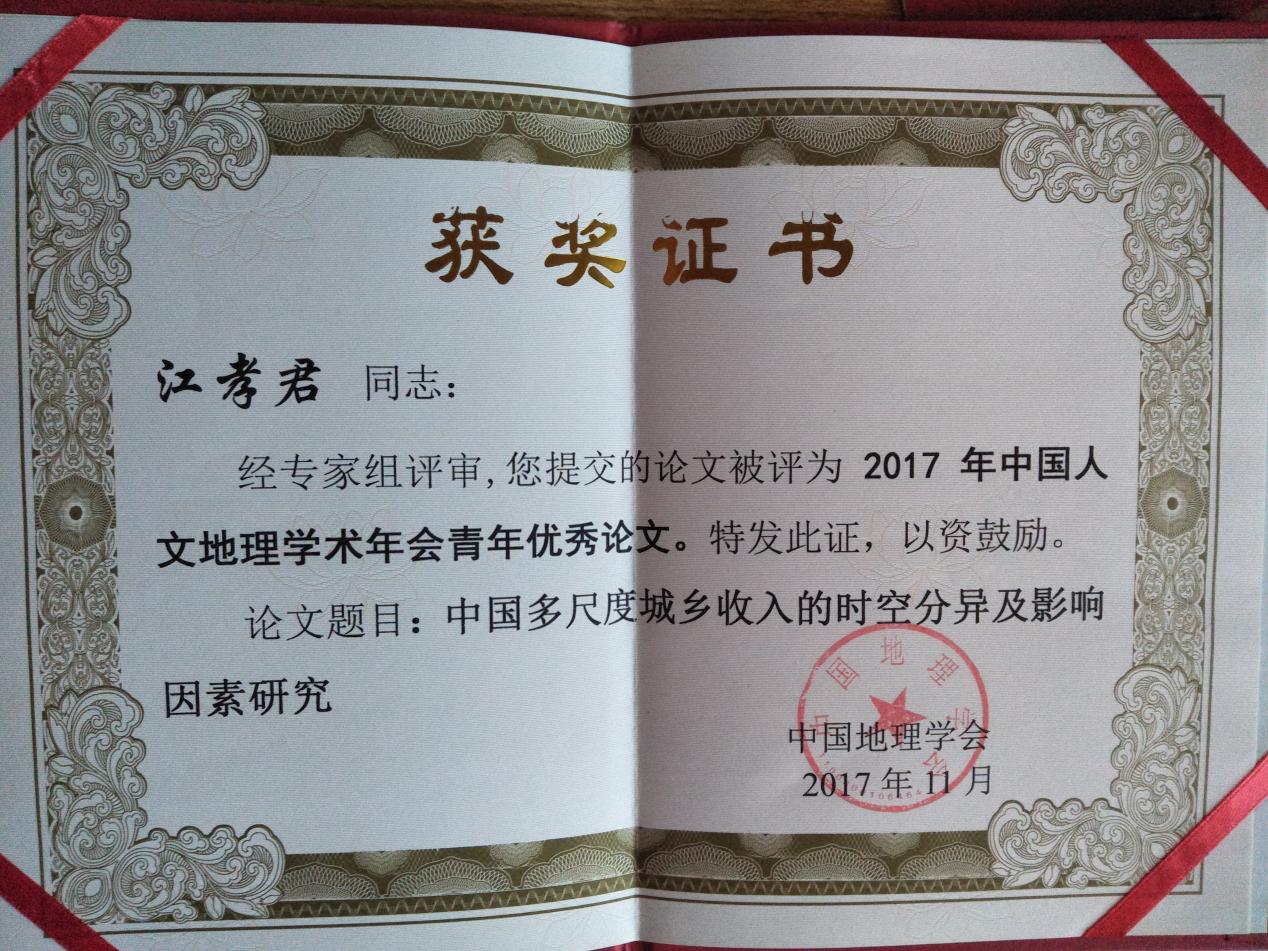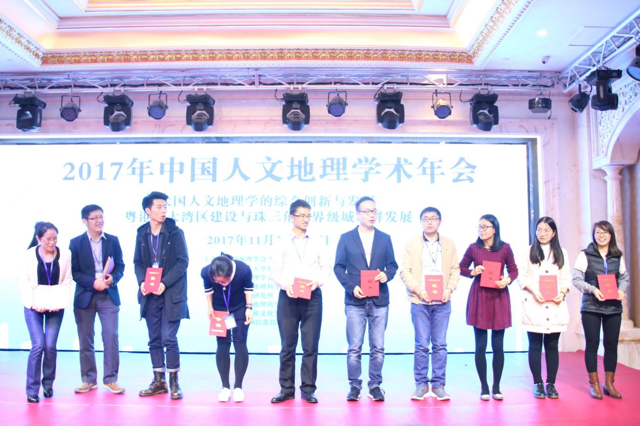 2017年11月24-26日,由中国地理学会人文地理专业委员会主办,华南师范大学永利集团304承办,广东省地理学会、中山大学地理科学与规划学院、广州地理研究所、广州大学永利集团304、广州新蚁族文化发展有限公司、ESRI中国信息技术有限公司协办的“2017年中国人文地理学术年会”在广州成功举办。我院数名师生代表参加会议,研究生李桐、刘鉴、江孝君等分别做了分会场报告。其中,我院博士研究生江孝君同学以题为“中国多尺度城乡收入的时空分异及影响因素研究”(指导老师:杨青山)的参选论文荣获“2017年度中国人文地理学术年会优秀青年论文”。