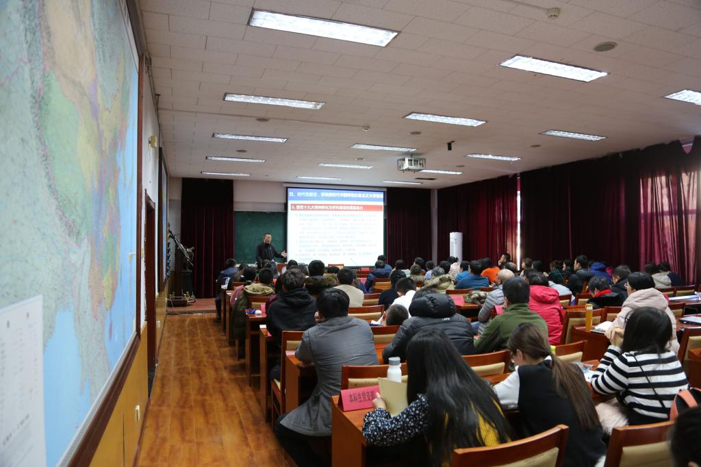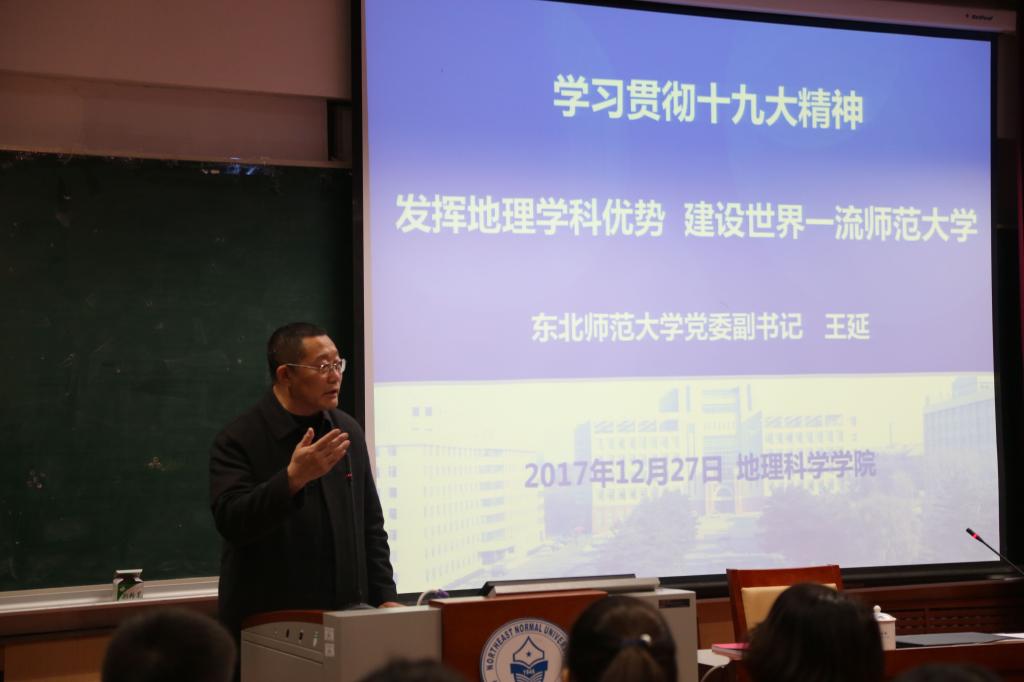 报告中,王延围绕“历史性盛会,开启新时代中国特色社会主义新征程”“全面性成就,彰显新时代中国特色社会主义生命力”“纲领性文献,发出新时代中国特色社会主义总动员”“时代性重任,呼唤新时代中国特色社会主义大学使命”四个方面,对十九大的主要精神、与高校关系紧密的问题、新时代高校使命及地理学科的责任担当进行了阐述。他要求党员同志对十九大思想系统掌握,抓实质、抓灵魂,重点明晰十九大报告中的系列经典表述。王延指出,中国的全面性成就彰显了新时代中国特色社会主义生命力,全体师生要对中国道路充满自信。随后,他结合地理学科的专业特点和优势,重点讲解了十九大报告中有关资源建设、生态文明等方面内容,肯定了地理学科的历史积淀、发展潜力和上升空间,并勉励学院师生把十九大精神转化为学科建设的现实动力,为建设美丽中国贡献力量,为建设新时代中国特色社会主义大学而奋斗。