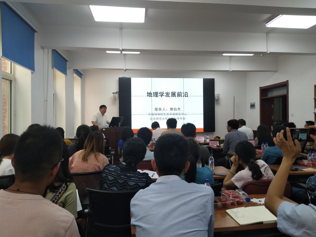 报告中,傅伯杰院士从地理学的内涵和特点出发,详细论述了地理学的综合性,展示和分析了新时代地理学“新的发展目标、新的研究范式、新的研究主题、新的数据来源、新的技术方法”,提出地理学未来发展“人地耦合系统要素关联、人地耦合系统承载力预警、全球综合风险的系统应对、人类活动对气候变化的综合影响、食物-能源-水综合可持续利用、生物多样性保护与生态系统服务管理、区域及全球环境污染的健康效应、可持续的城镇化与乡村振兴、海量地理数据处理方法与模型系统”的九点展望,并通过四个综合与耦合实现的具体科学示例,阐述了地理科学“从格局-过程研究到系统模式的转变、从要素研究到系统研究的提升、从理论研究到应用研究的链接、从知识的创造到社会决策的贯通”四个发展趋势。报告结束后,傅伯杰院士同与会师生还就黑河流域的模拟集成案例、生态系统的空间尺度、自然-人文系统的融合方法等问题展开讨论,并对我校地理学的学科发展、方向凝练、人才培养等方面提出宝贵建议。