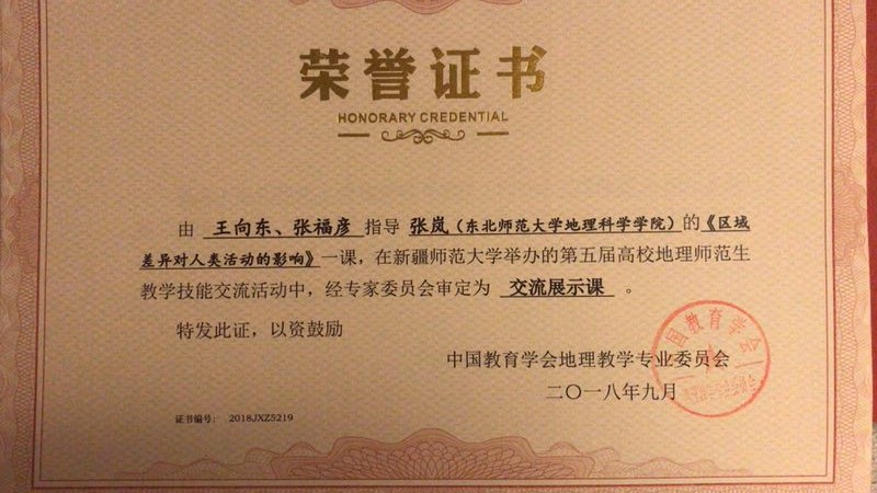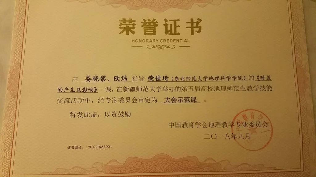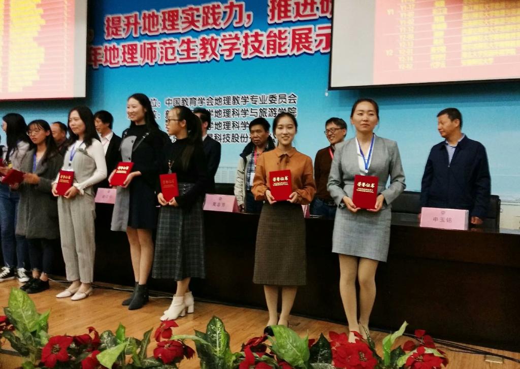 2018年9月28日至30日,第五届全国高校地理师范生教学技能展示交流活动暨“落实核心素养,提升地理实践力,推进研学旅行”研讨会在新疆师范大学举行。我院2015级地理科学(公费师范)专业本科生荣佳琦(指导教师:娄晓黎,欧炜)斩获最高奖项,被专家委员会审定为“大会示范课”(一等奖),在大会上进行教学展示(仅有六位选手大会展示);我院2017级地理课程与教学论专业研究生张岚(指导教师:王向东,张福彦),被专家委员会审定为“交流展示课”(三等奖)。