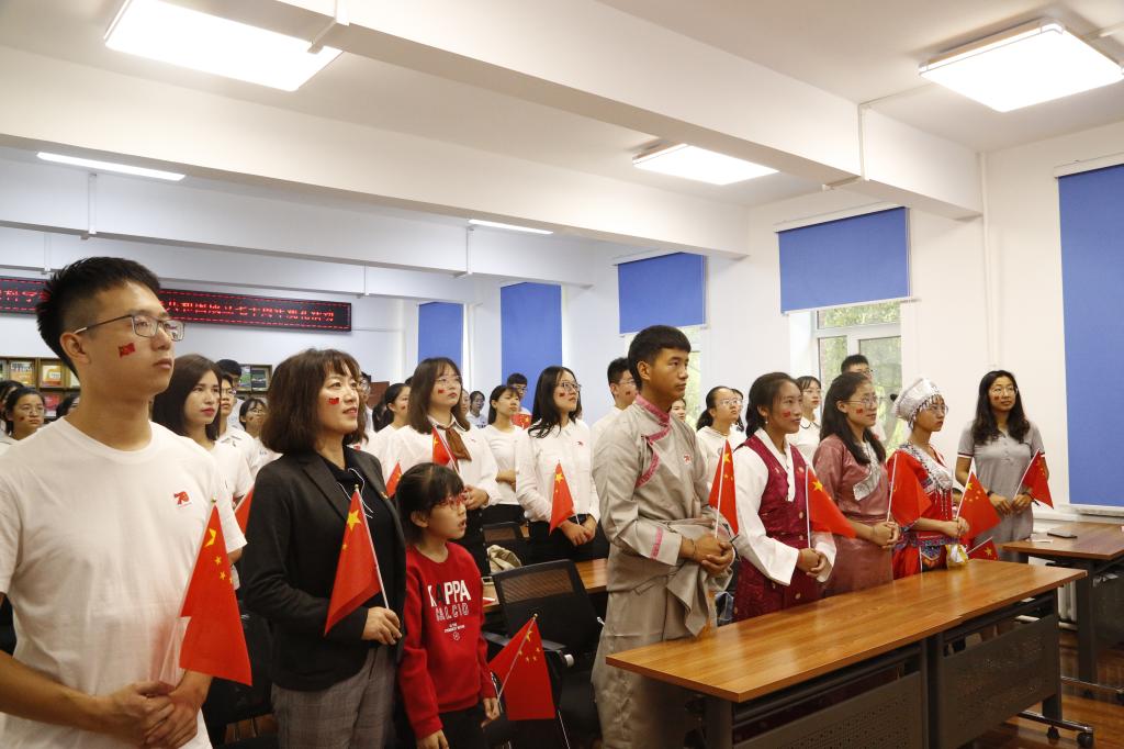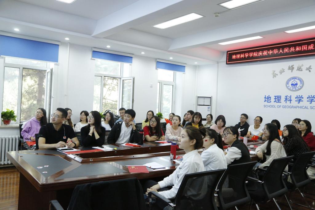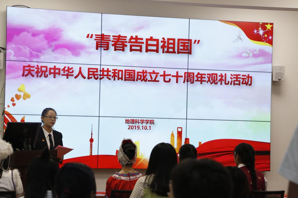 活动以歌唱《我和我的祖国》拉开了序幕,莘莘地理学子怀着激动自豪的心情歌颂着对祖国的热爱。2016级本科生郭蕊分享了她弟弟参加阅兵仪式的经历,辛苦而又自豪。在万众瞩目之中,在海陆空三军仪仗队手举国旗,迈着铿锵有力的步伐向我们走来,同学们深情吟唱国歌,向祖国表达自己最诚挚的祝福。除了学院两个集中的会场外,寝室、餐厅也有地理学子认真观看仪式的身影。