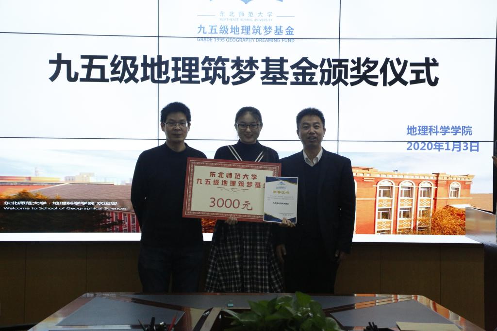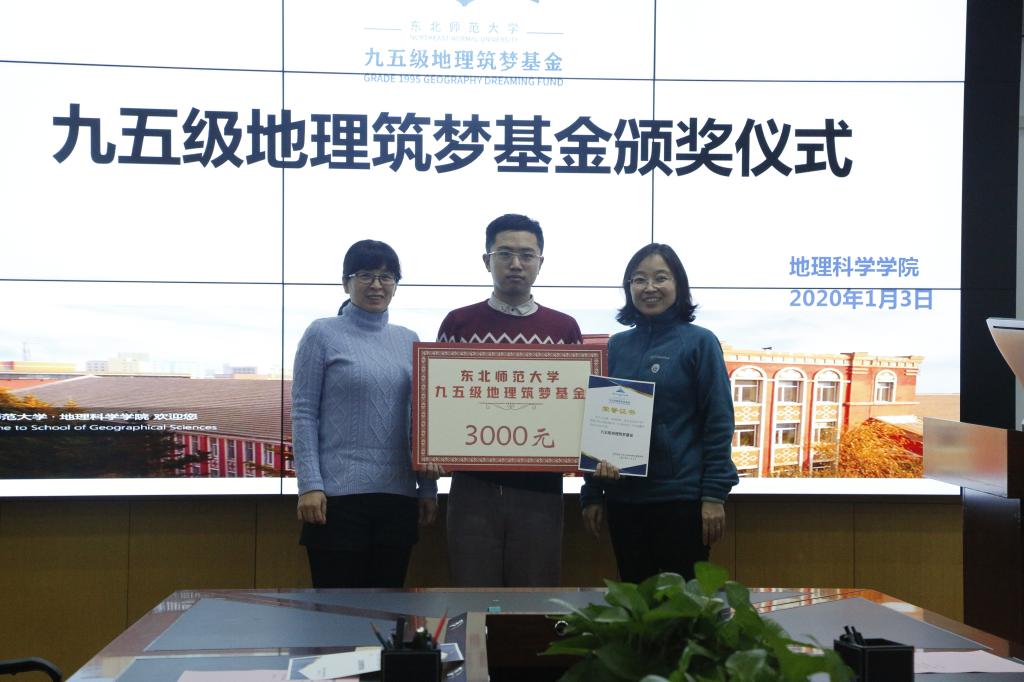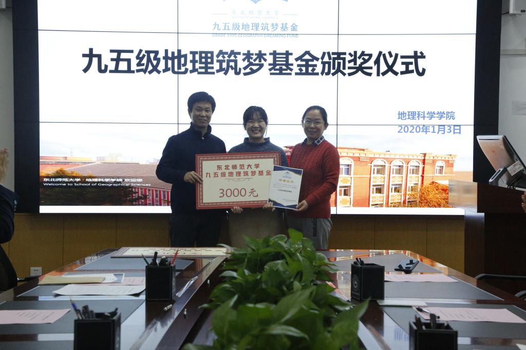 颁奖仪式前,基金会副会长兼秘书长、我校教务处副处长王向东介绍了“永利集团304九五级地理筑梦基金”的基本情况与设立初衷。随后,“九五级地理筑梦基金会”成员代表分别为首批获奖学生颁发了获奖证书及奖金。张浩然代表获奖学生发言,表达了对基金会的感谢以及自己励志成才、感恩回报的决心。最后,学院党委书记王升忠致辞,对“九五级地理筑梦基金”的引领作用和开创性意义给予肯定,表达了对基金会校友回报母校、助人育才的感谢与赞赏。