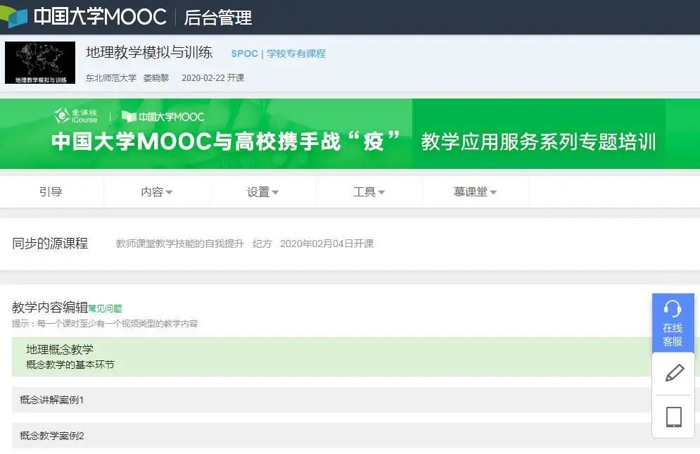 同步SPOC源课程开课时间为2月4日-3月16日,保证了学生学习内容选择的自由度,因此教师将地理课堂教学技能中不需要黑板等设备呈现的技能,如地理课堂的讲解、导入、提问以及课堂小结等技能的学习调整到学期初。同时,课程内容顺序尽量与《地理课程与教学论》以及《地理教学设计》内容有机衔接。