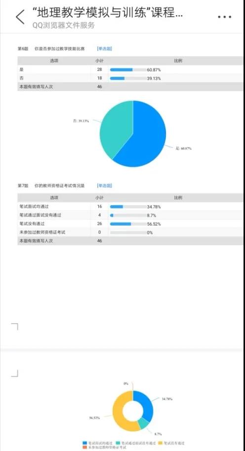 在这个特殊时期,本课程采取线上线下结合,单项技能与综合训练结合,个人训练与小组合作结合,集中讲授与小组指导结合等多种方式,确保学生能够较好地掌握所学知识,提升教师职业素养。从第一周的后台学习数据以及学生反馈来看,学生在线观看视频和微课学习都比较积极,随堂测验完成情况也比较好;学生学习目标明确,师生学习共同体已经建立;学生小组内部紧密配合,各小组同学能够高效完成课堂学习任务,并对后续的学习做好了充足的准备。