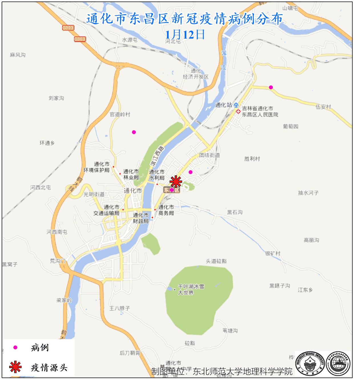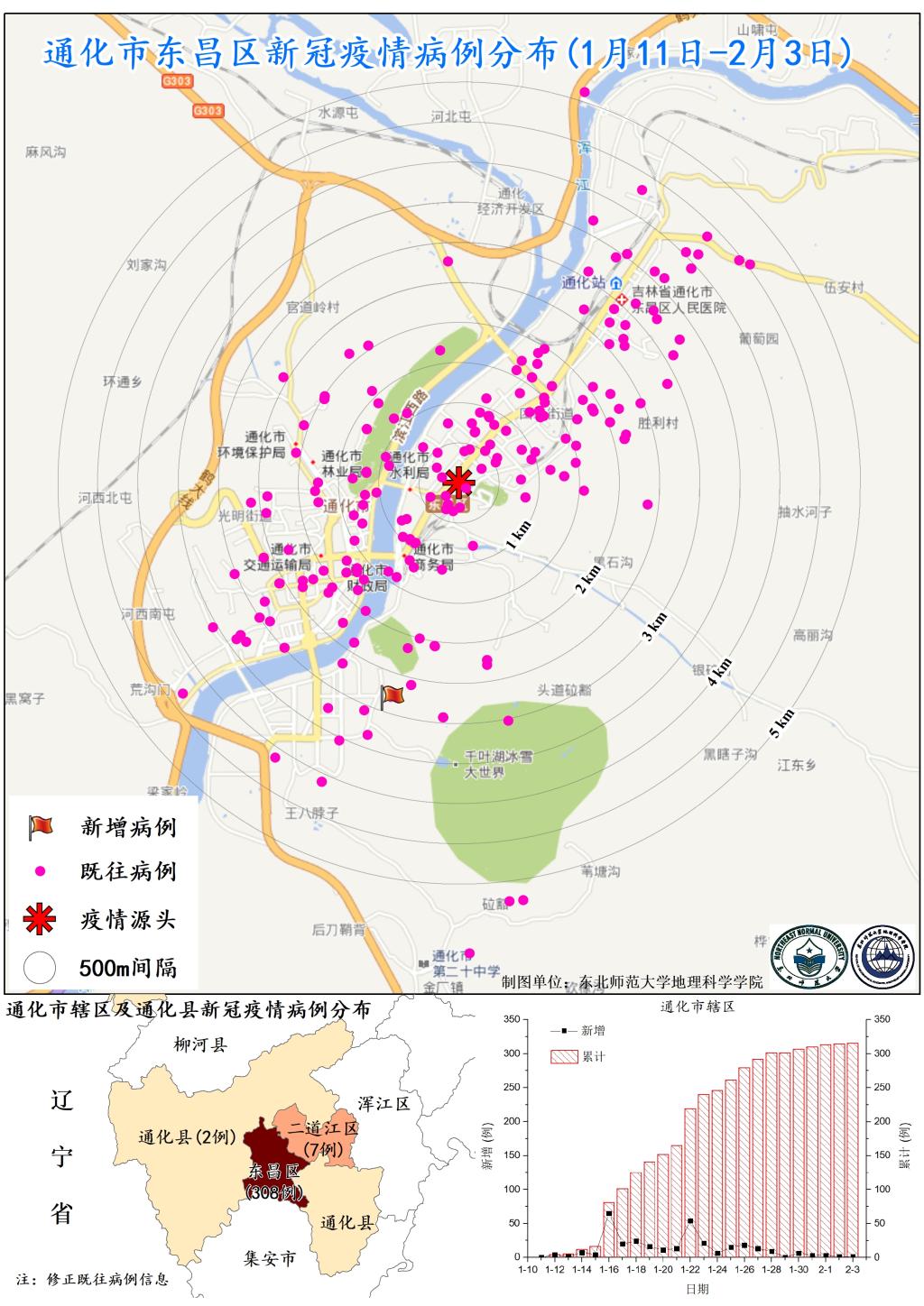 图3. 通化市东昌区新冠疫情病例分布(1月11日-2月3日)
