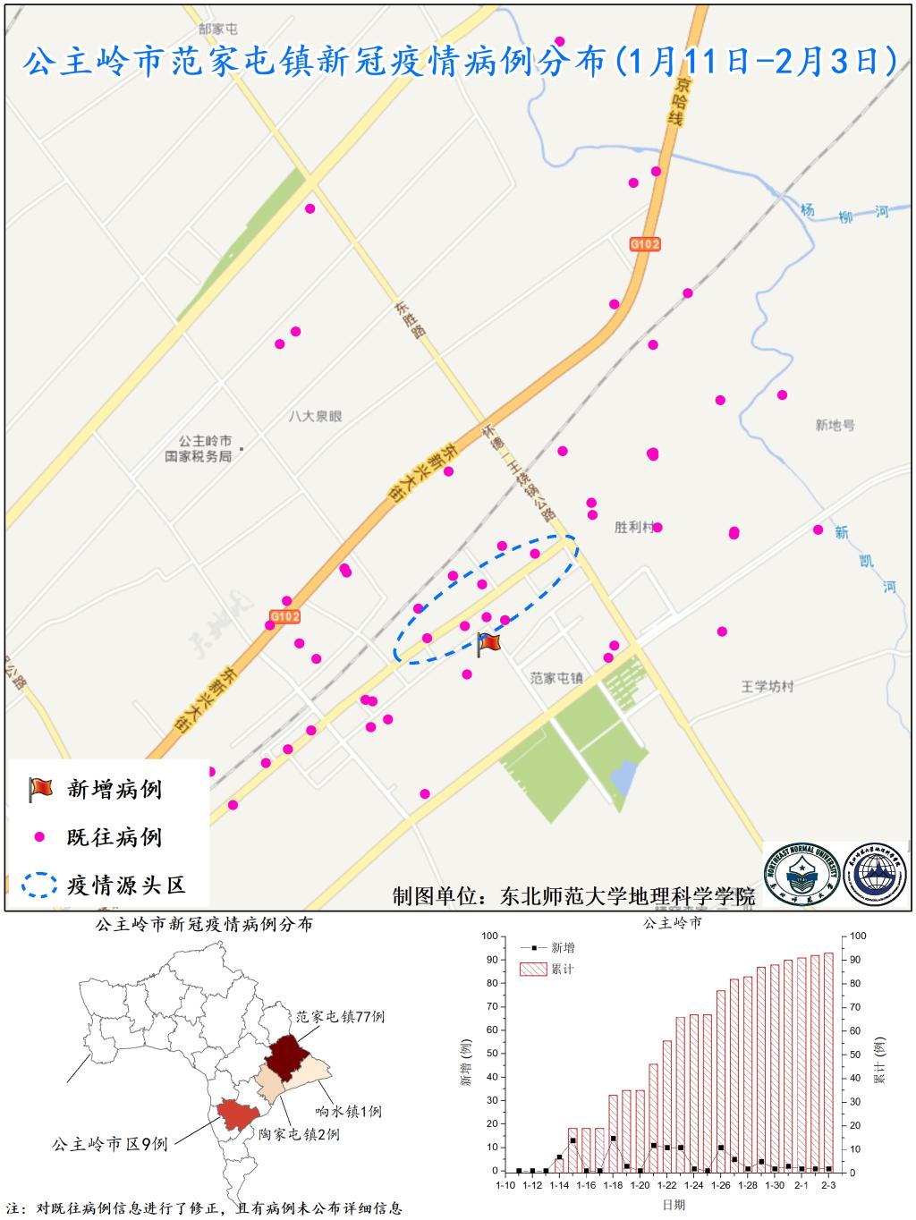 图5. 公主岭市范家屯镇新冠疫情病例分布(1月11日-2月3日)