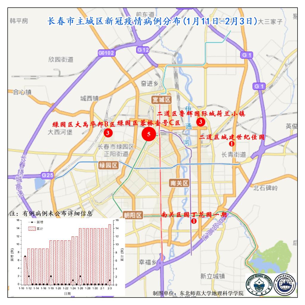 图2. 长春市主城区新冠疫情病例分布(1月11日-2月3日)