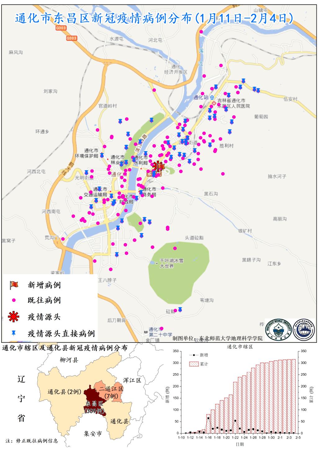 图2. 通化市东昌区新冠疫情病例分布(1月11日-2月4日)