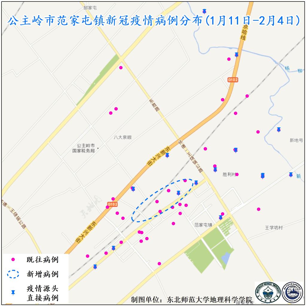 图3. 公主岭市范家屯镇新冠疫情病例分布(1月11日-2月4日)