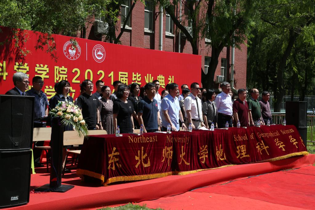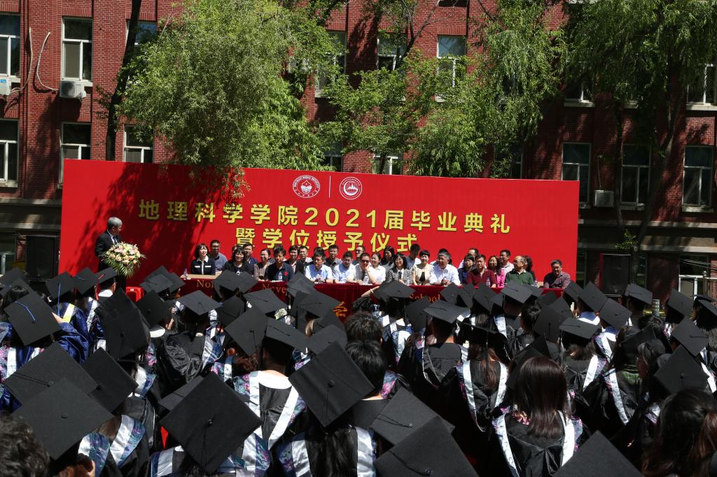 院长白娥向2021届毕业生致辞,她对全体2021届毕业生顺利完成学业表示最热烈的祝贺,勉励毕业生要思家国需求、树高远宏志,秉地理情怀、修博大襟怀,承东师精神、担民族大义,不负青春韶华、不负地理精神,为人民做贡献、为国家做贡献、为人类做贡献。