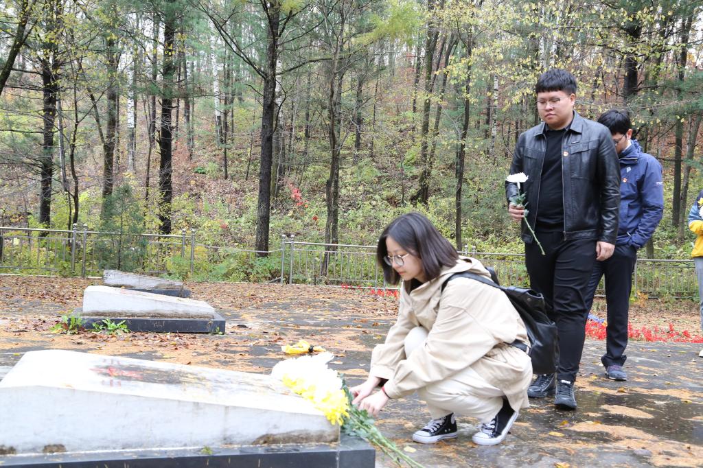 本次红色主题实践活动分为三个环节。一是参观金川革命烈士墓陵园。园内安葬着曹亚范将军等11位抗联烈士,学院党委书记王升忠在烈士墓前为全体党员上了一堂生动的党课,深情地讲述抗联英雄曹亚范的光荣事迹,年仅二十九岁的他在金川县金川屯东山脚下,不幸被当地的反革命分子杀害,以身殉国。在场的党员无不为之动容,并为烈士们敬献鲜花,以表对烈士们的尊敬和缅怀。二是重温入党誓词。学院党委组织委员沈雯老师领誓,全体党员在烈士墓前,面向党旗重温入党誓词。三是参观辉南抗联红色文化体验馆。该文化馆内陈列着抗联将士们在辉南战斗的史实资料,展现了辉南抗联气势恢宏可歌可泣的历史。