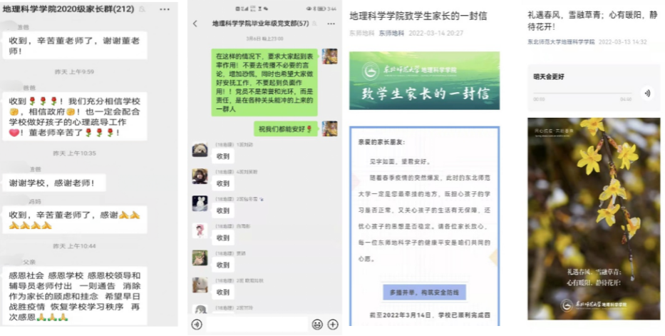 让家长放心。学院住校党政班子、辅导员定期走访学生寝室,了解生活状况,虚心听取工作建议,完善学院抗疫举措。同时学院通过致信的方式,及时将校园疫情防控政策和学生情况告知家长,消解担忧、增进理解、获取支持。辅导员每天在家长群中及时回应问题,学生家长纷纷表示理解,并为身在防疫一线的师生加油鼓劲。