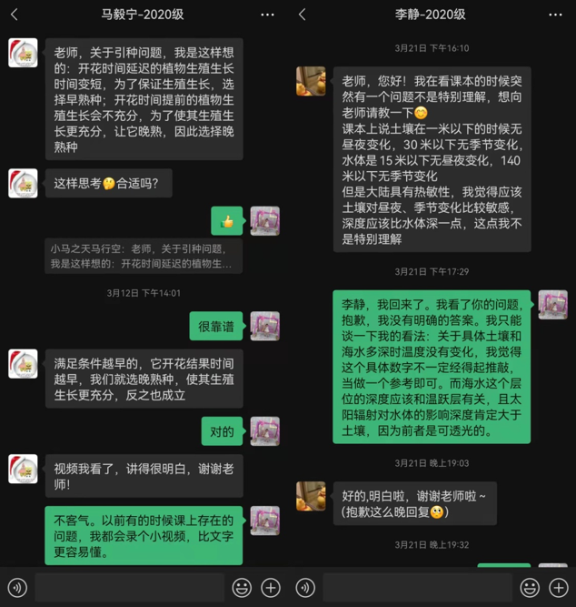 通过微信、腾讯会议和录屏软件,以文字+语音+视频相融合的方式,确保第一时间对学生提出的问题进行解答。充分利用学生课后自学时间,针对重、难点问题,教师录制答疑视频,对知识点展开更为细致、详尽的分析,巩固学生学习效果。