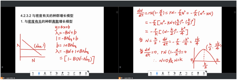 以“种群的增长模型”一节为例,本章节旨在通过数学公式推导和归纳总结,以严谨的数学模型来揭示系统的内在机制并对系统行为进行预测。在讲授本章节时,充分利用腾讯会议的“互动批注”功能,在线完成数学公式的推导,注重科学假设的提出和模型结构的优化,以问题为导向开展教学,如,哪些因素决定种群的大小、哪些参数决定种群对自然和人为干扰的反应速率等。