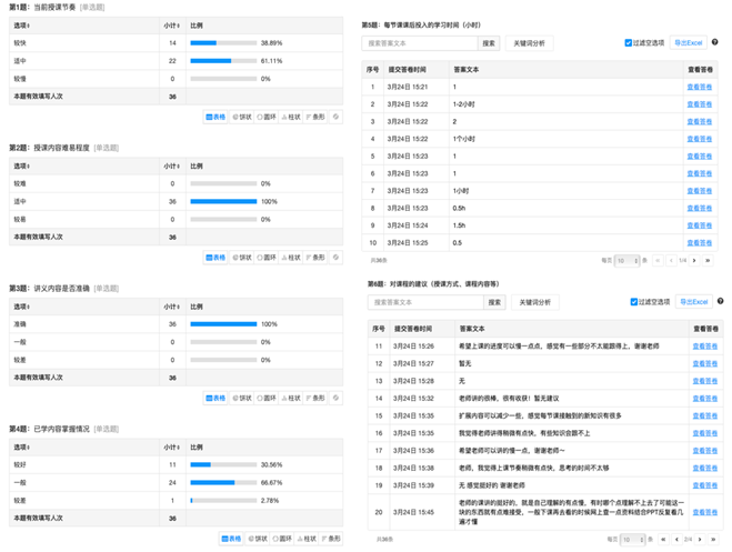 通过发放在线问卷,征集学生对授课节奏、难易程度、知识点掌握、课后学习投入情况的反馈,吸收采纳学生对授课方式、课程内容等方面的建议,及时调整授课节奏,进一步强化重点内容的讲授,增设课后拓展资料推荐的环节,使授课内容更具针对性,并体现一定程度的差异性。