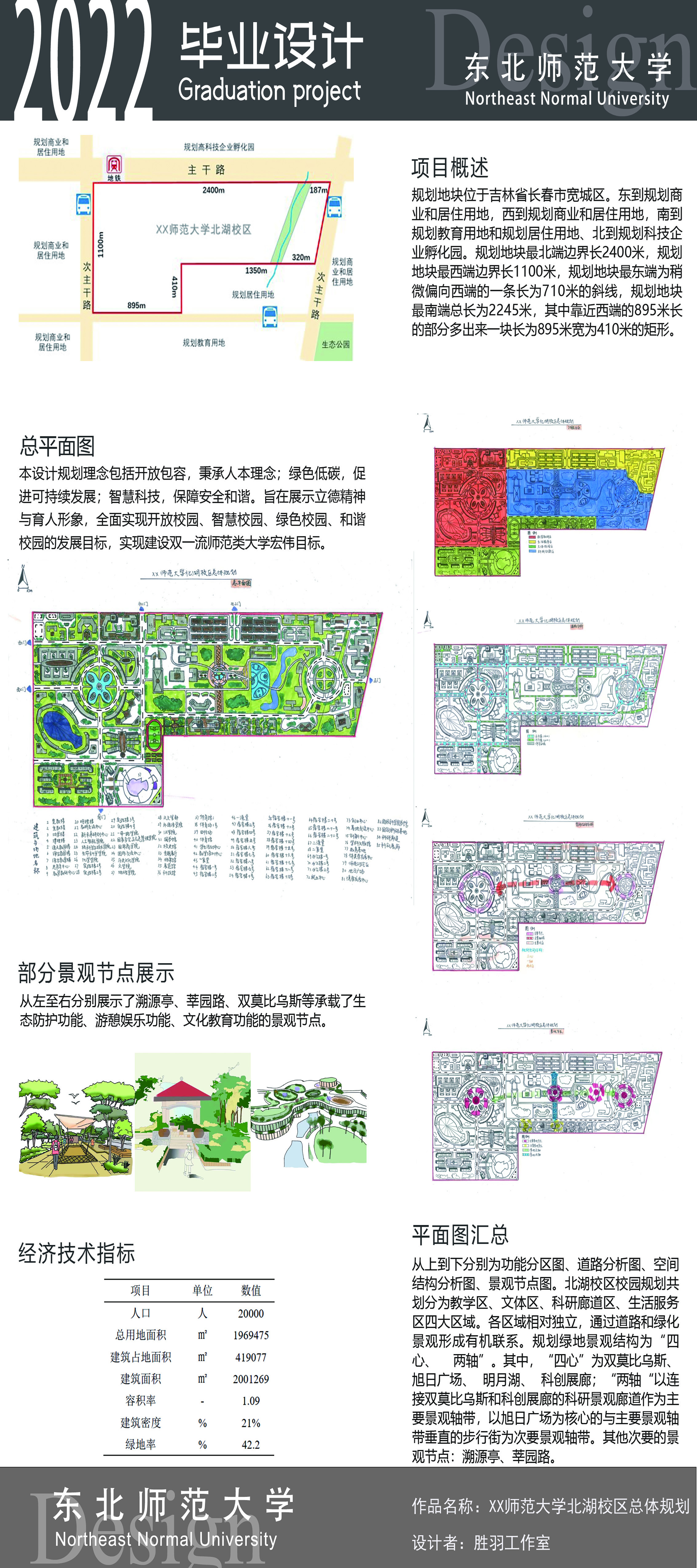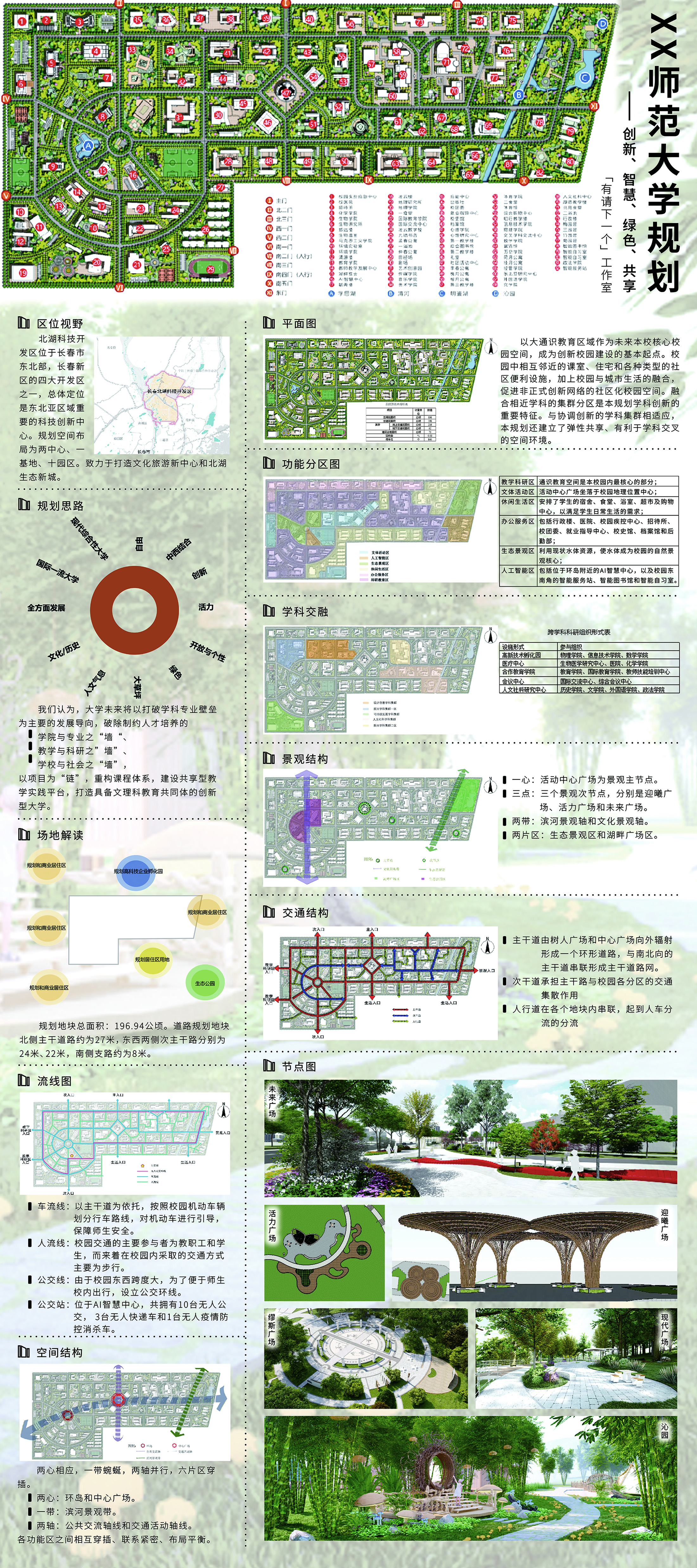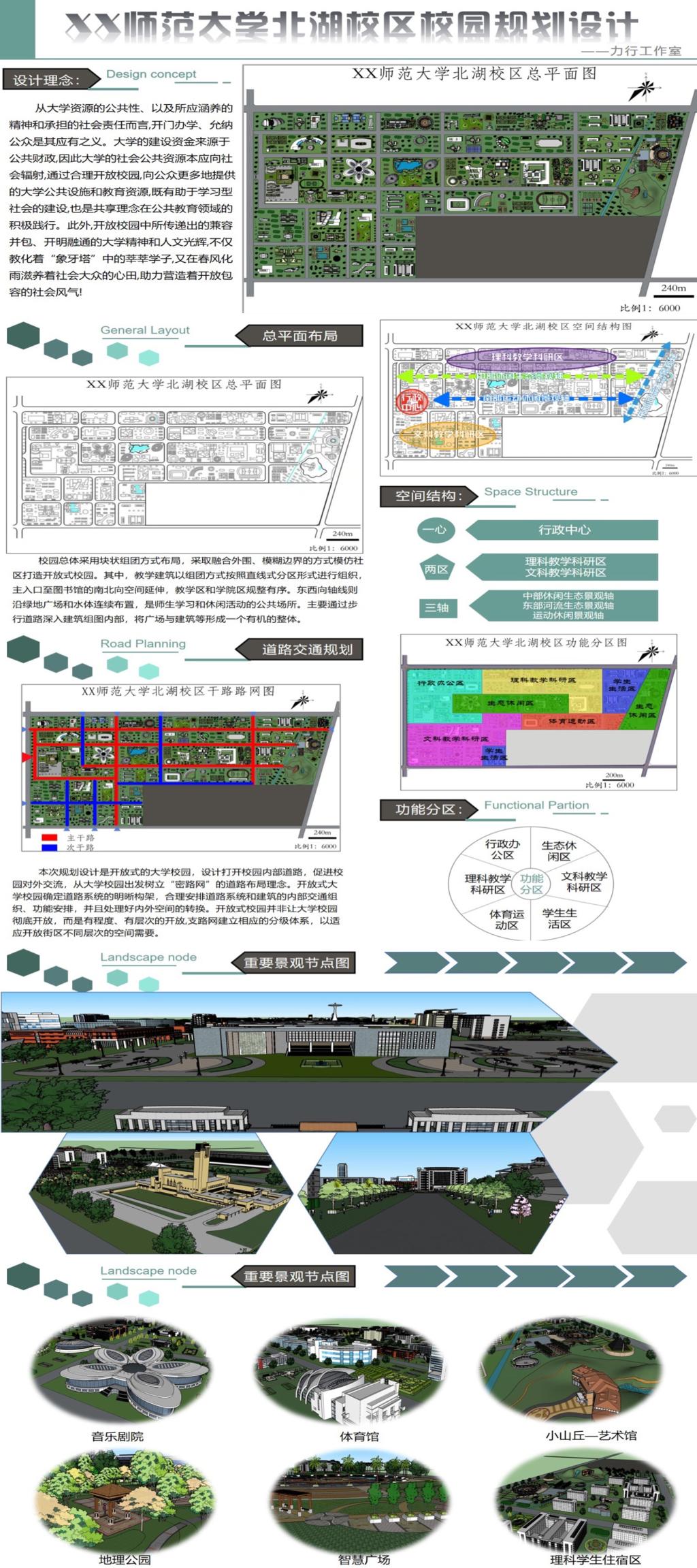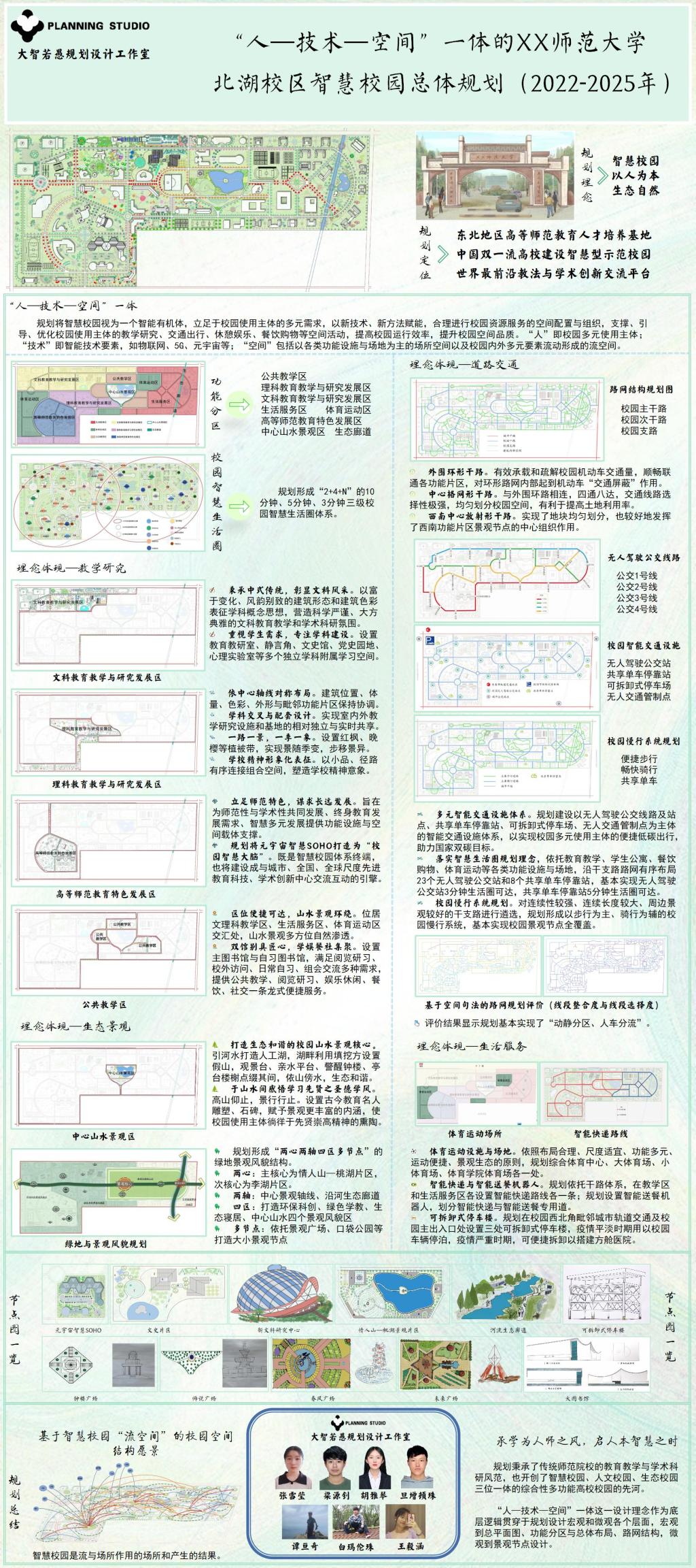 本次毕业设计以“XX师范大学北湖校区总体规划设计方案”为主题,由专业教师拟定项目任务书,学生自由组队组建工作室,合作完成毕业设计任务。线上组织召开“毕业设计作品汇报会”,各工作室通过多种方式展示作品,由专业教师和学生代表组成评审小组,对规划作品进行点评和成绩评定。