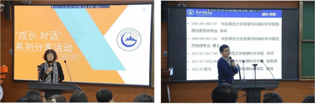 活动中,汪祖丞以“困惑地理、魅力地理、大爱地理——从学十年到从教十年”为题,谈到地理学习的经验、对地理学科的理解和对地理教师的认识,讲述了从困惑地理到魅力地理再到大爱地理的过程。魏冶以“培养自我驱动力,追逐梦想不emo”为题,从自身成长、学习和工作经历出发,分享了如何进行选择、如何应对焦虑以及多线程处理问题和时间管理的方法,鼓励同学培养自我驱动力,勇敢追逐梦想。孙仲秋以“坚持最初选择,付诸持续行动”为题,将个人成长融入到地理信息科学专业发展的之中,详细介绍了专业教师与研究特色,并分享个人在成长过程中的坚持和行动,引导同学们坚定初心,付诸努力。
