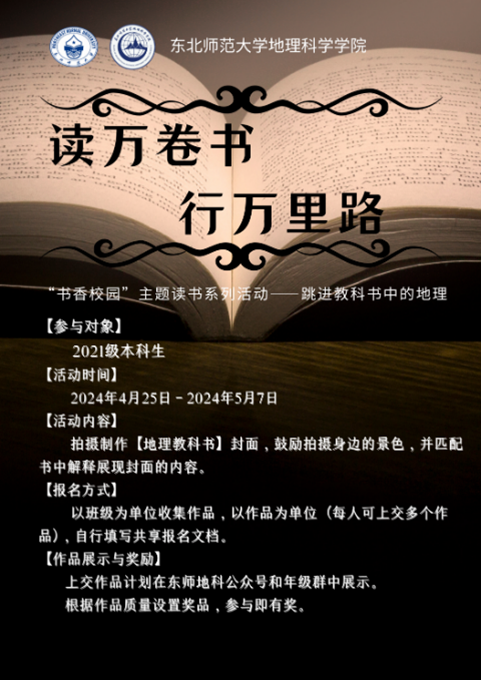 本次活动着重结合地理学科较强实践性的特征,读万卷书,行万里路,将书中理论与现实实际相结合,采用“教科书”封面的拍摄方法,照片剪辑操作简单,形式生动有趣。本次活动鼓励同学们拍摄身边的景色作为地理书封面,并与书中解释展现封面的内容拍照对比,进一步引导学生将所学习的地理知识与生活实践进行对比与思考。本次活动引发热烈反响,19位参赛选手报名,共收集作品36份。根据作品的数量、图文相关度、地理特色等标准,共选出一等奖3人,二等奖4人,三等奖6人,参与奖若干,形成2021级本科生《“跳进教科书中的地理”封面作品集》。
