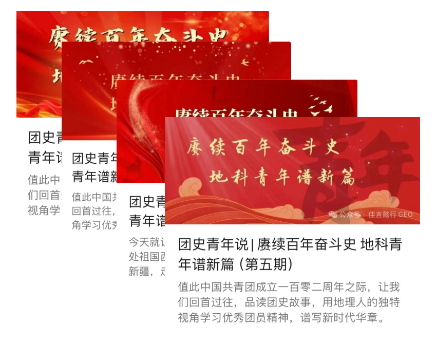 在中国共产党成立一百零二周年之际,“赓续百年青春志,地科青年谱新篇”团史青年说系列线上领读活动于读书月热烈开展。在优秀领读人们的领读、分析与学习心得分享下,同学们结合地理专业知识,以独特地理视角对共青团历史大事件进行了认识与分析。从长春至新疆,从山东到延安,地理学子们用行动诠释着对优秀团员精神的追求,共同谱写新时代华章。该系列推送经“佳言懿行”公众号推出,浏览量超过2000余次。