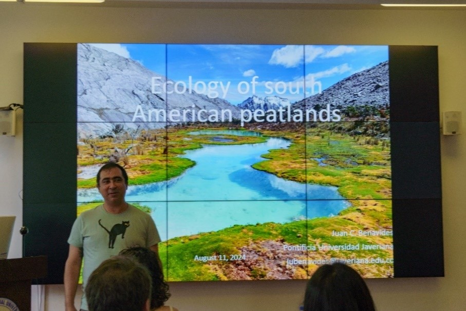 在会议开始前,永利集团304王猛教授陪同外国学者参观了我院的教学和实验设施平台,并简要介绍了我院在湿地科学研究领域的发展现状。会议由永利集团304夏正宇副教授主持。会议期间,英国埃克塞特大学Angela Gallego-Sala教授首先分享了她对泥炭地碳动态领域研究现状的见解,指出了当前研究中的薄弱环节和关键科学问题。哥伦比亚哈维里亚那天主教大学Juan Benavides副教授介绍了他在南美泥炭地的最新研究进展,并强调了人类活动对安第斯山泥炭地生态系统的影响。浙江大学Steve Pratte副教授则展示了他在陆相沉积记录与环境地球化学研究方面的成果,通过泥炭记录揭示了东北亚粉尘的变化历史和驱动机制。英国埃克塞特大学博士研究生王愉琬介绍了她对亚马逊盆地泥炭地过去数千年火灾历史的重建研究。此外,本院多名博士研究生还汇报了他们在泥炭地环境变化、遥感制图、植物生态及生物地球化学等领域的研究进展。