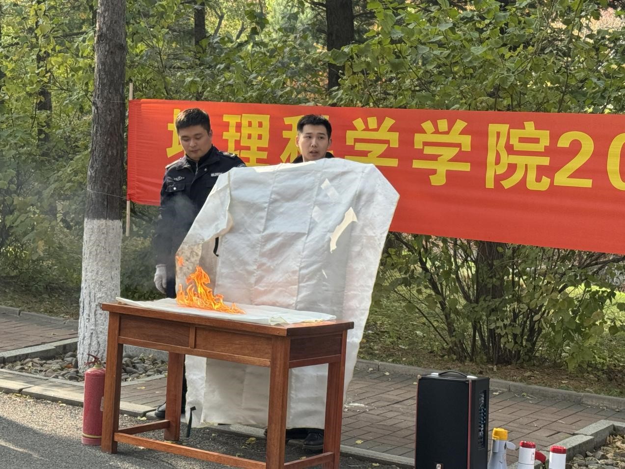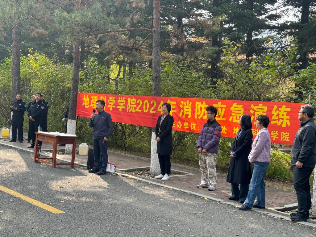 演练开始,地理楼警报响起,楼内3个应急防火门全部打开,消防疏导员组织引领学院楼内师生快速有序地撤离到安全地带。在防火安全实操和演练环节,卜兆君代表学院讲话,告诫同学们要提高消防安全意识,时刻注意防范于未然,时刻保持安全的警觉性,保护自身安全。之后,保卫处徐欣康老师为大家讲解了遇见火情或危险时的正确逃生方式,演示了防火毯和灭火器的使用方法和注意事项。最后,参与活动的老师和同学亲身体验灭火器的灭火操作,在保卫处消防科各位老师带领和悉心指导下完成灭火实操演练。