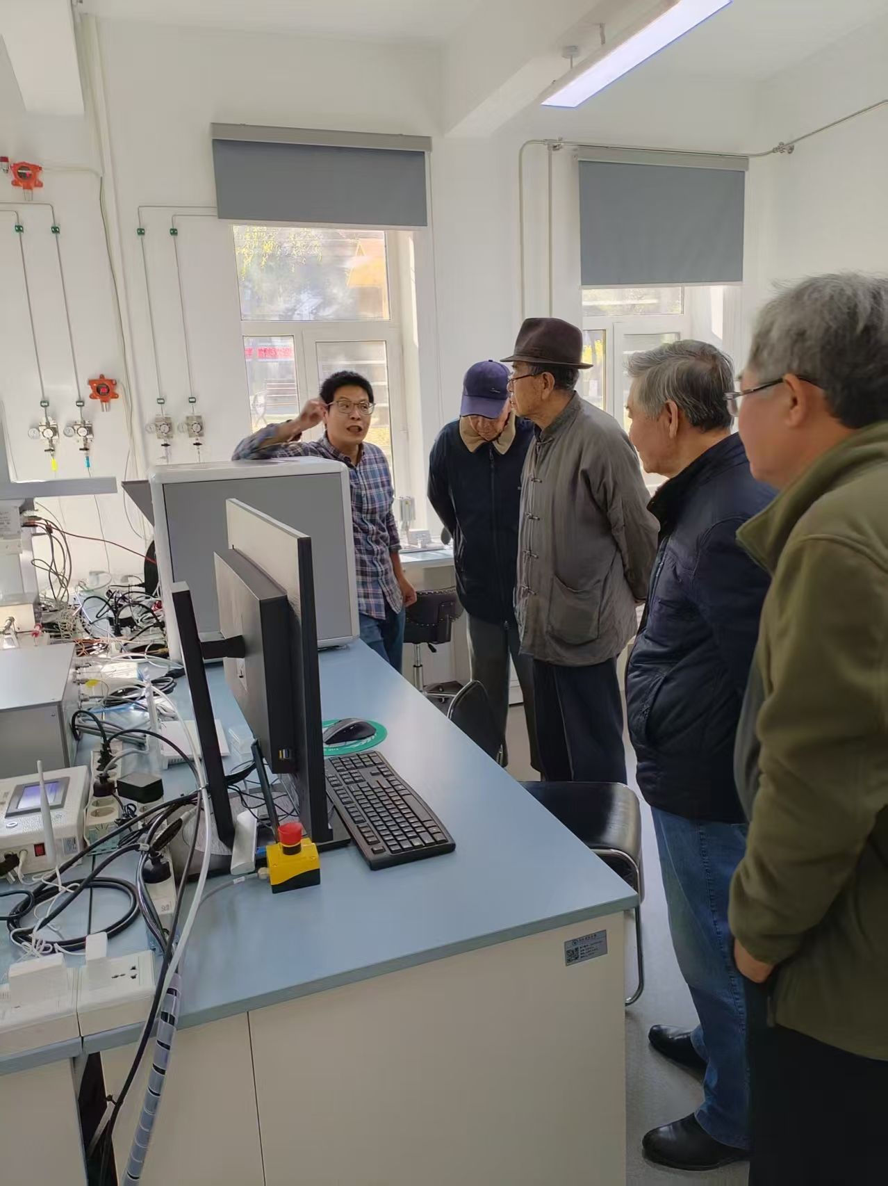 退休教师代表与学院教师合影 李鸿凯介绍操作流程及仪器性能