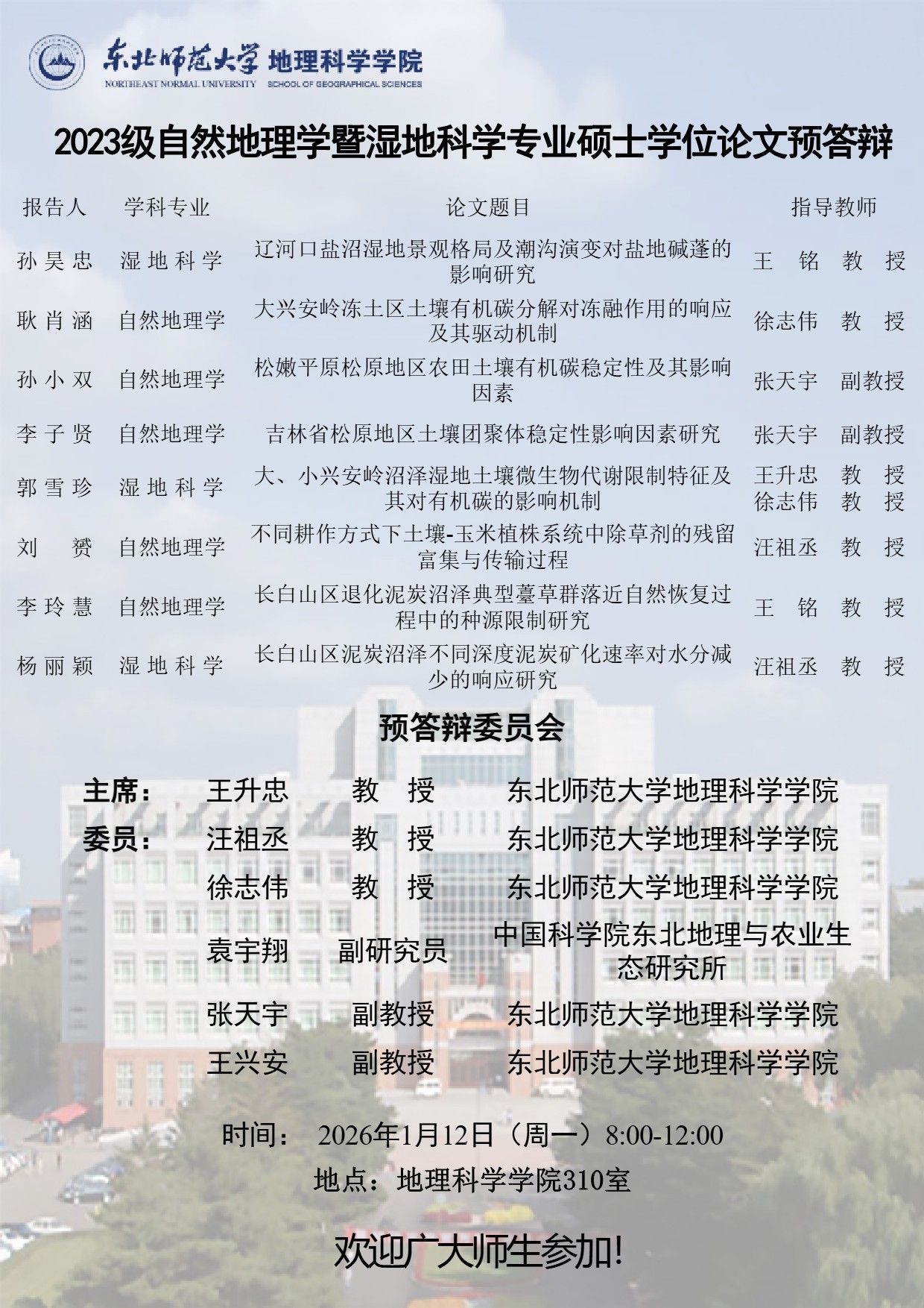 【硕博答辩】2023级自然地理学暨湿地科学专业硕士学位论文预答辩