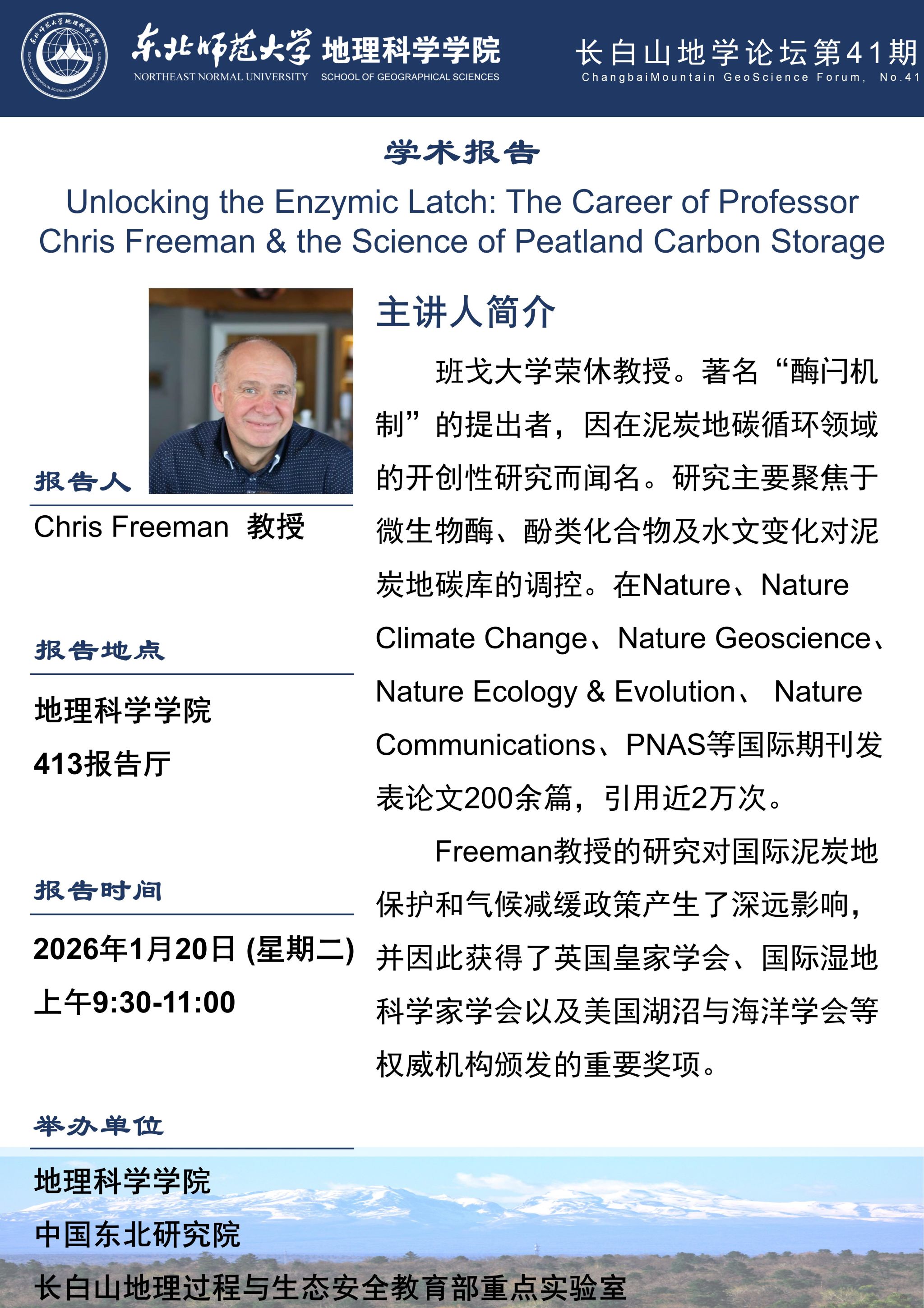 【长白山地学论坛(第四十一期)】Chris Freeman:Unlocking the Enzymic Latch:The Career of Professor Chris Freeman & the Science of Peatland Carbon Storage