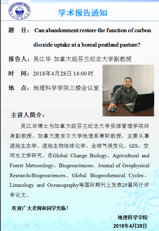 【地理与生态论坛】吴江华:Can abandonment restore the function of carbon dioxide uptake at a boreal peatland pasture