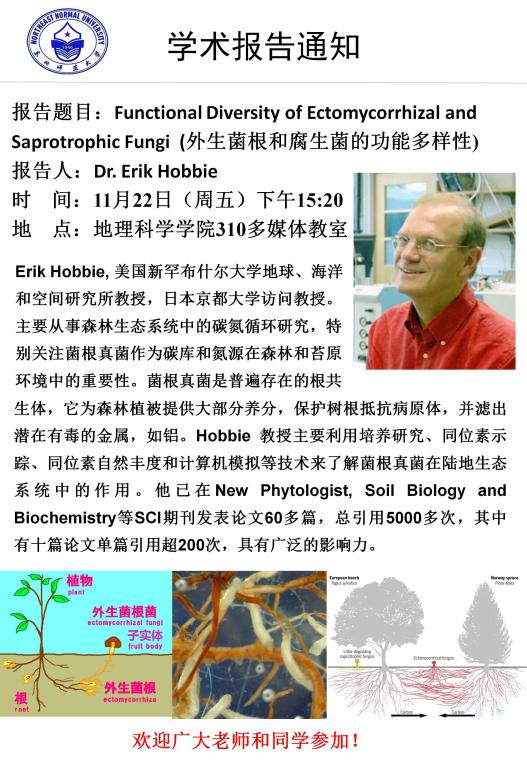 Dr.Erik Hobbie:Functional Diversity of Ectomycorrhizal and Saprotrophic Fungi(外生菌根和腐生菌的功能多样性)