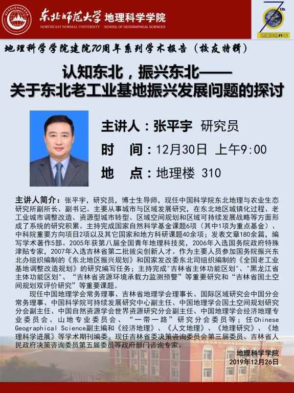 【永利集团304建院70周年系列学术报告·校友特辑】张平宇:认知东北,振兴东北——关于东北老工业基地振兴发展问题的探讨