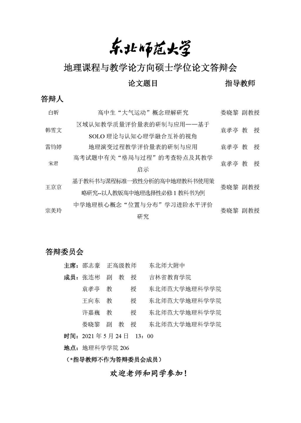 【硕博答辩】地理课程与教学论方向硕士学位论文答辩