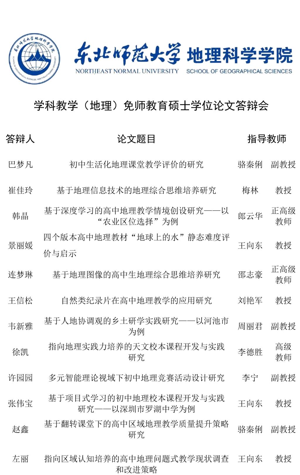 【硕博答辩】学科教学(地理)方向免师教育硕士学位论文答辩
