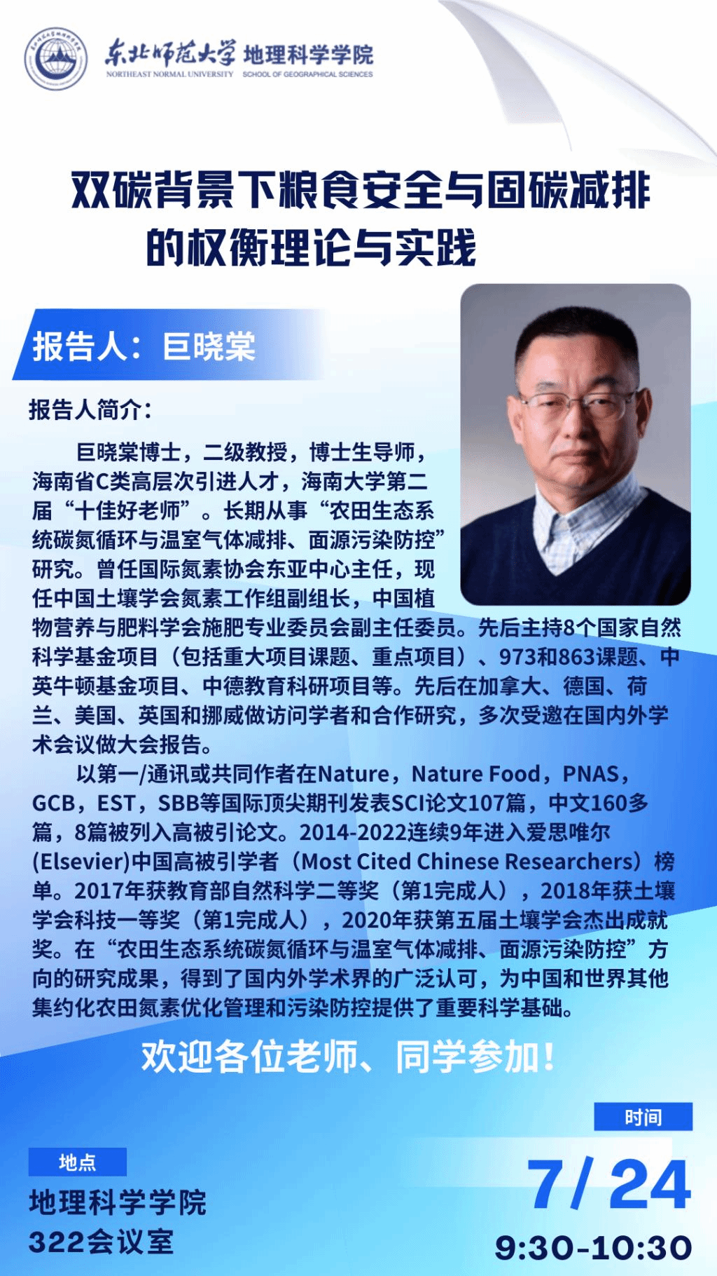 【学术报告】巨晓棠:双碳背景下粮食安全与固碳减排的权衡理论与实践