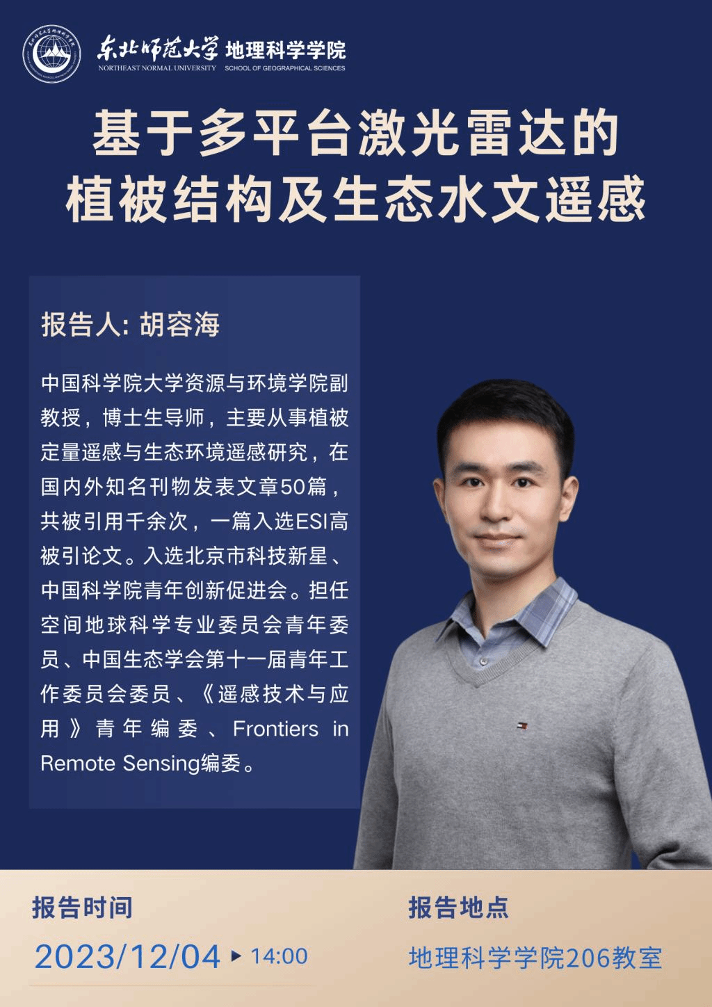 【学术报告】胡容海:基于多平台激光雷达的植被结构及生态水文遥感