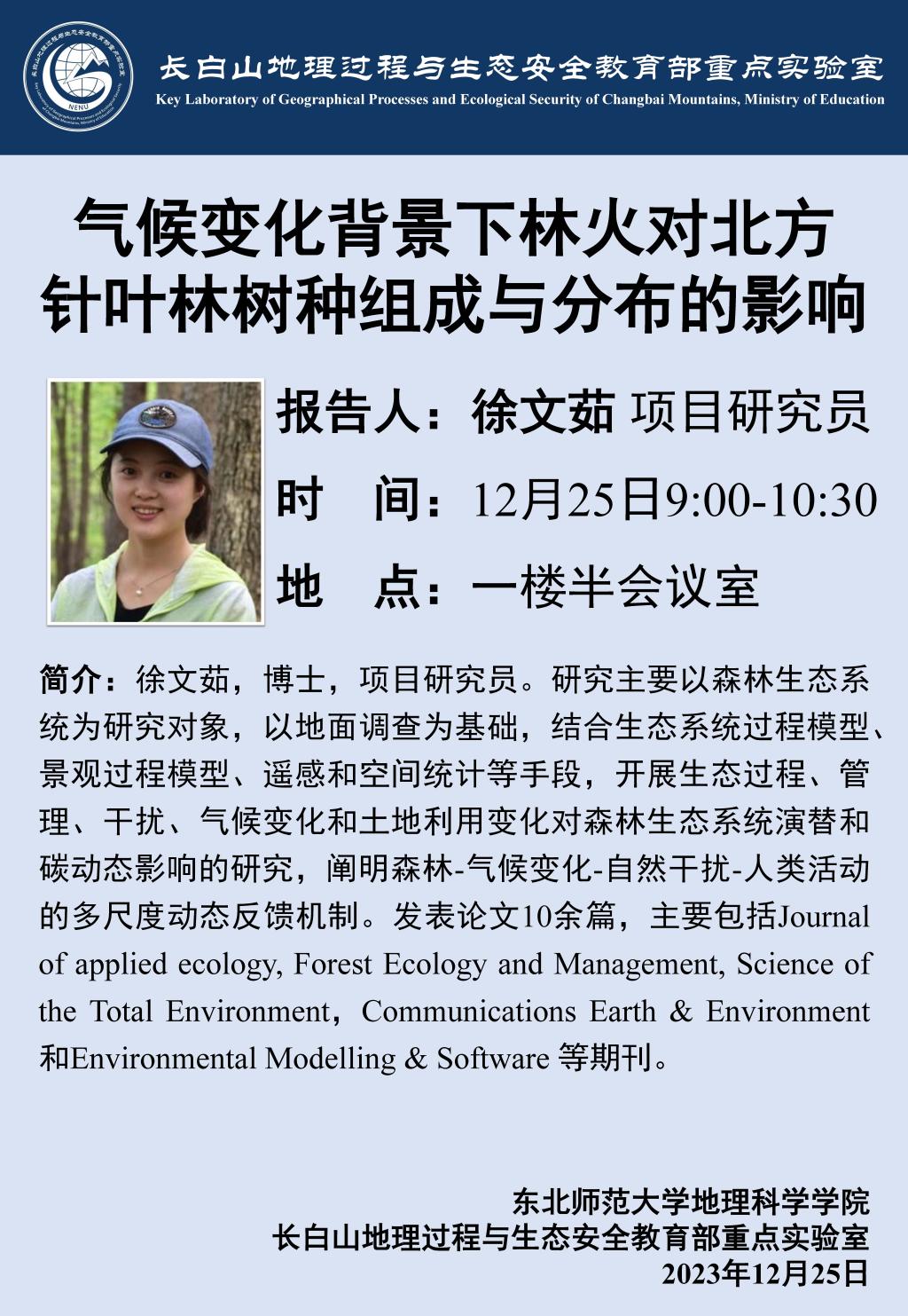 【学术报告】徐文茹:气候变化背景下林火对北方针叶林树种组成与分布的影响