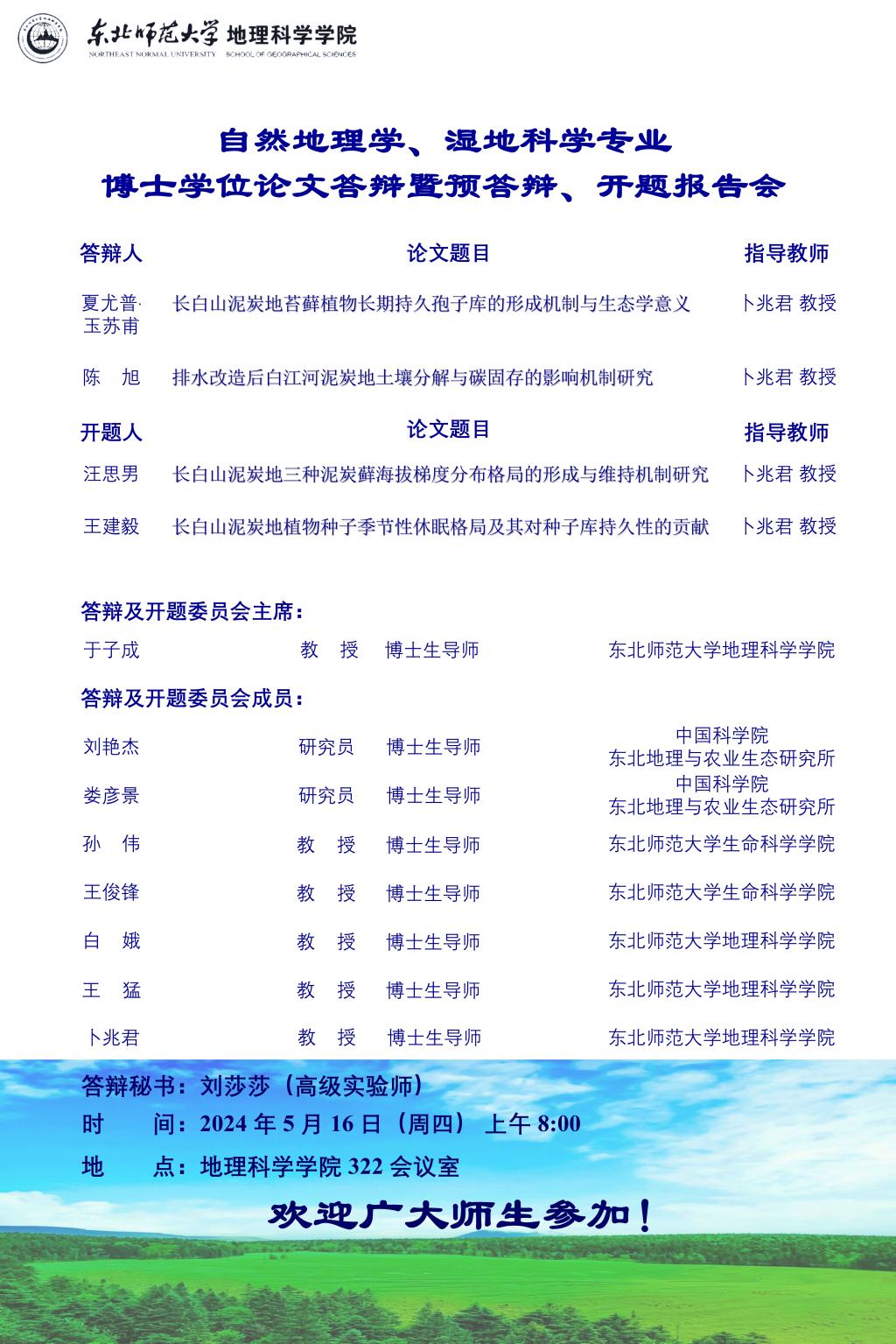 【硕博答辩】自然地理学、湿地科学专业博士学位论文答辩暨预答辩、开题报告会