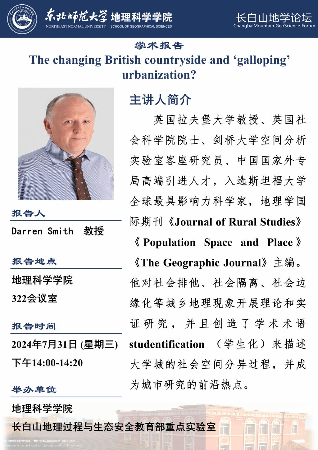 【长白山地学论坛(第六期)】Darren Smith: The changing British countryside and‘galloping’urbanization?