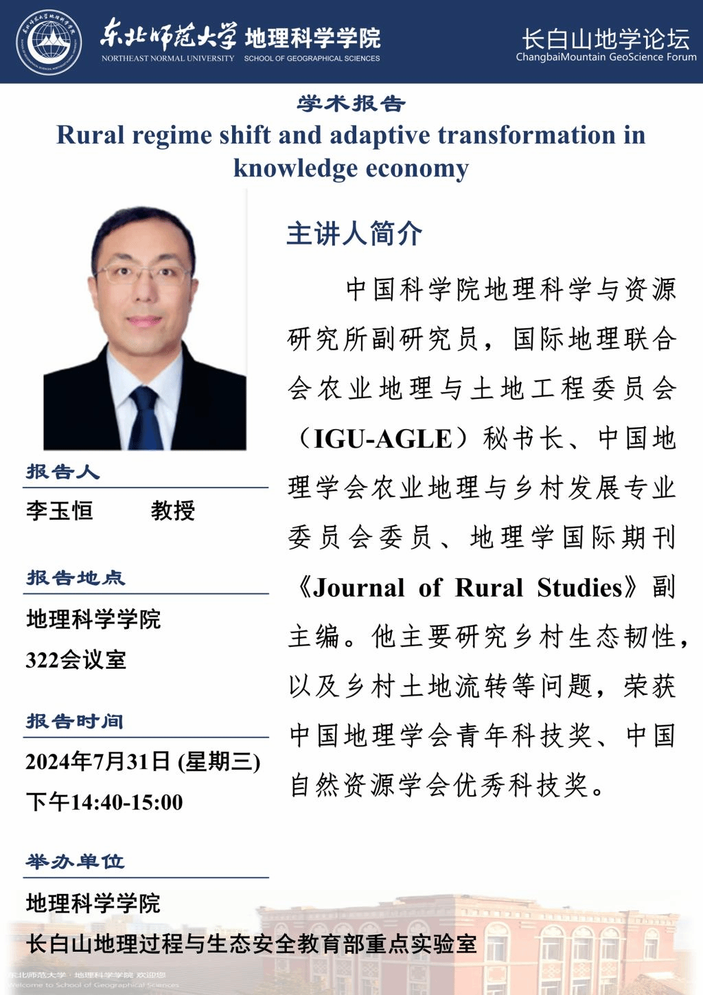 【长白山地学论坛(第六期)】 李玉恒: Rural regime shift and adaptive transformation in knowledge economy
