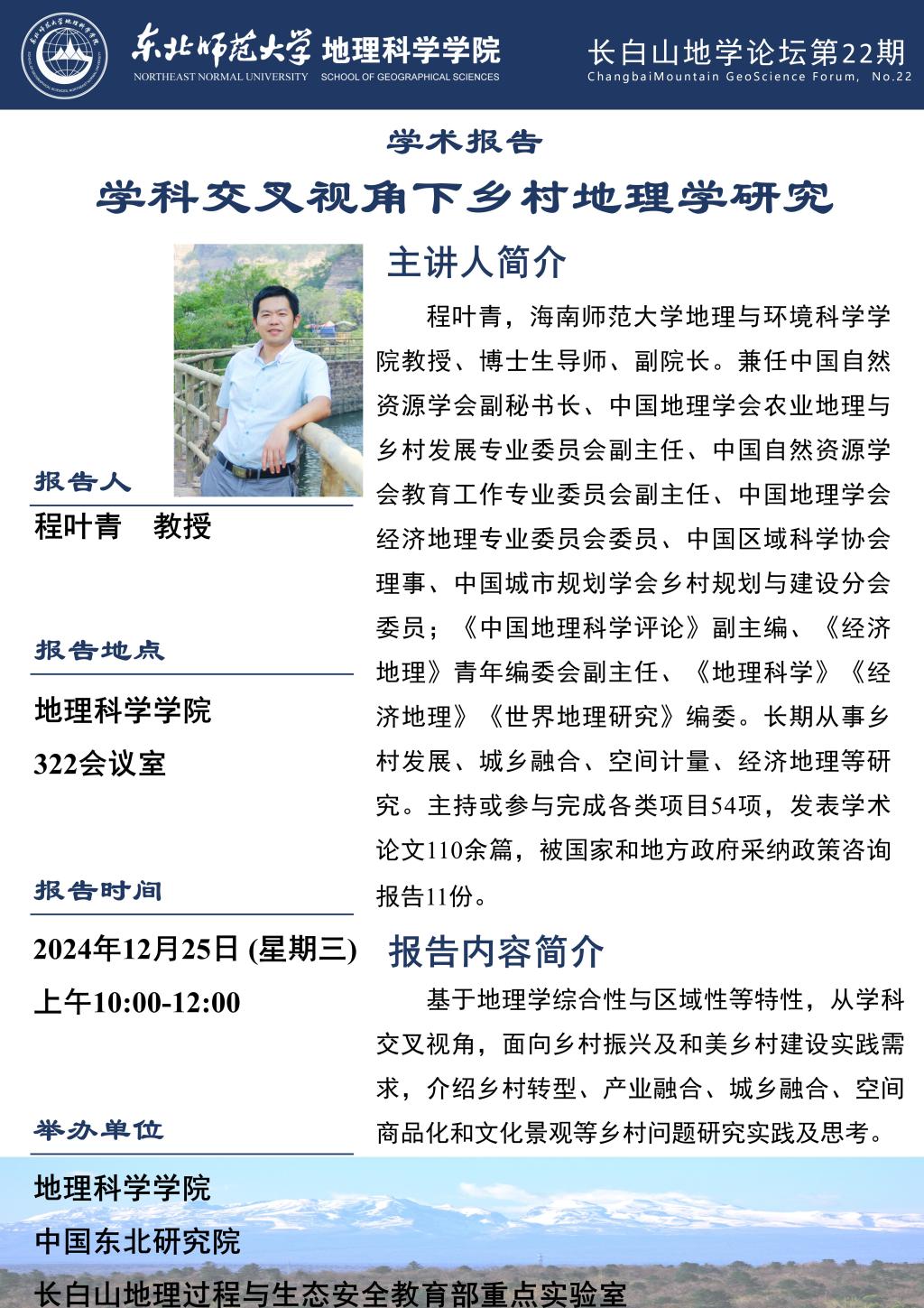 【长白山地学论坛(第二十二期)】程叶青:学科交叉视角下乡村地理学研究