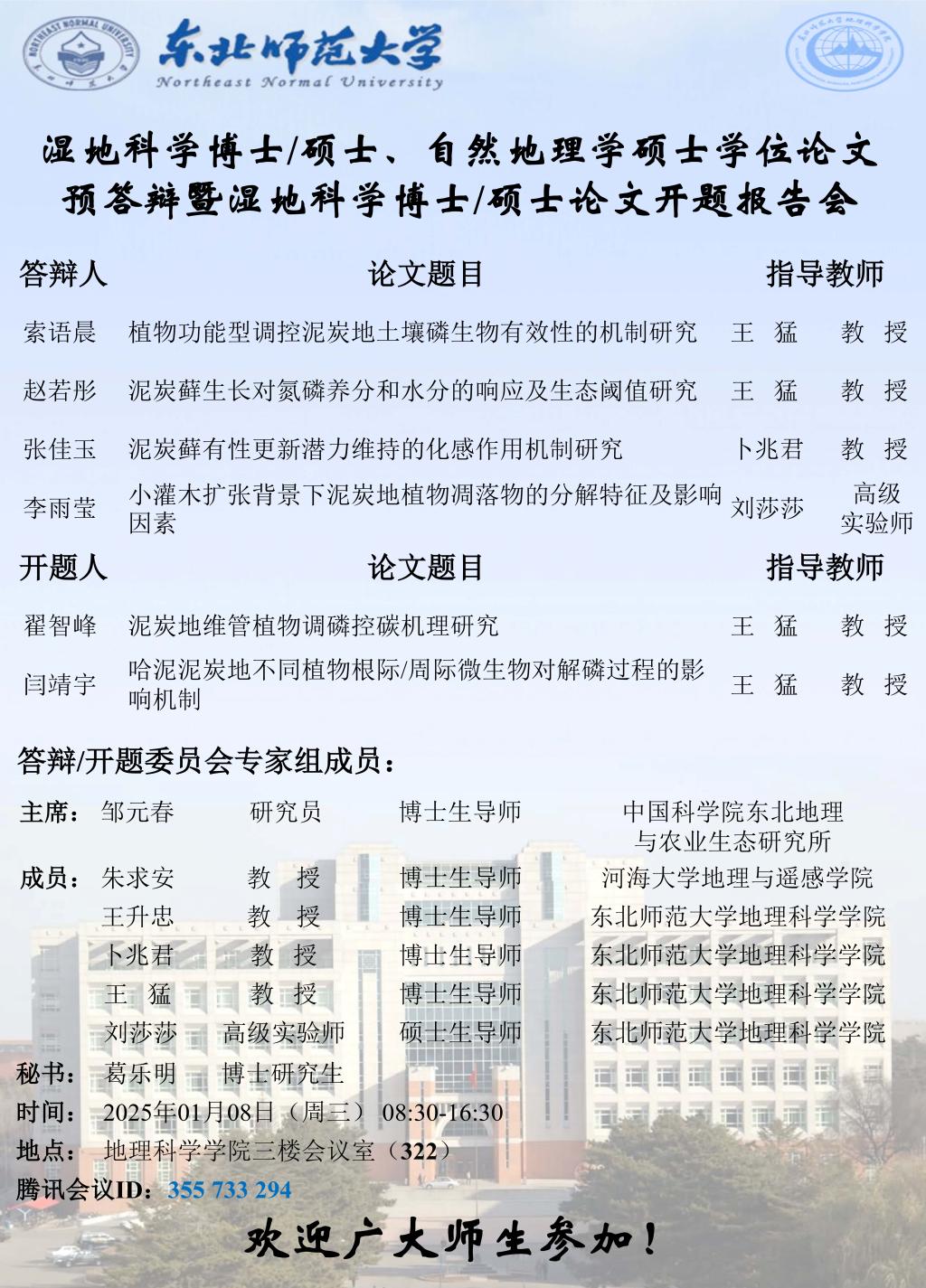 【硕博答辩】湿地科学博士/硕士、自然地理学硕士学位论文预答辩暨湿地科学博士/硕士论文开题报告会