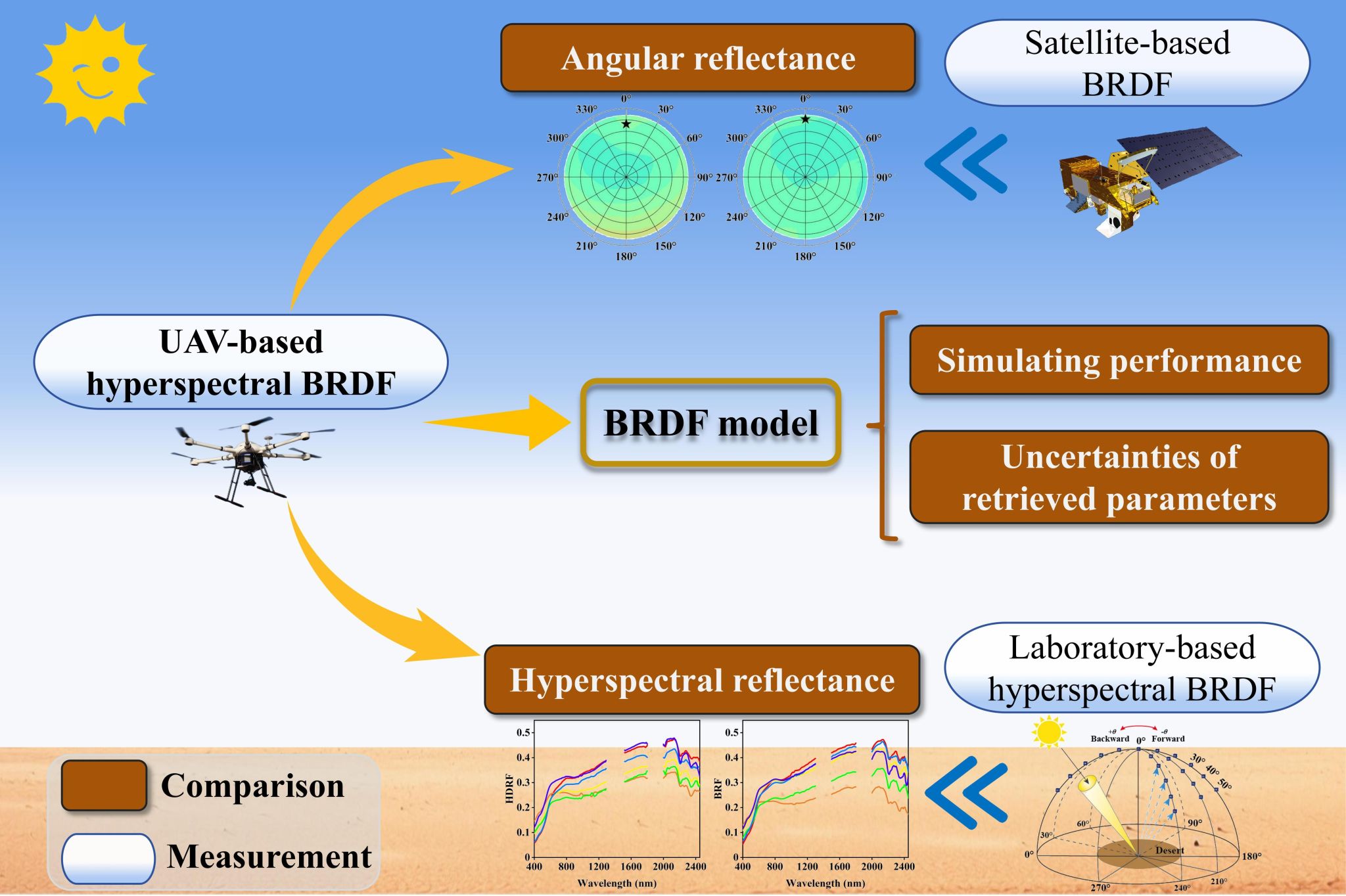针对这一关键问题,本研究利用无人机搭载高性能光谱辐射计,在我国西北典型沙漠区域开展观测(图1),实现了350–2500 nm 光谱范围、半球空间多角度的高光谱 BRDF 准确测量(图2)。研究整合了双光谱仪校准、参考板各向异性校正以及基于影像的观测几何匹配等关键流程,有效降低了环境变化和仪器误差对观测结果的影响。通过与实验室和卫星观测数据的系统对比,并结合 BRDF 模型评估,全面验证了无人机测量高光谱 BRDF 数据的有效性与可靠性(图3)。
