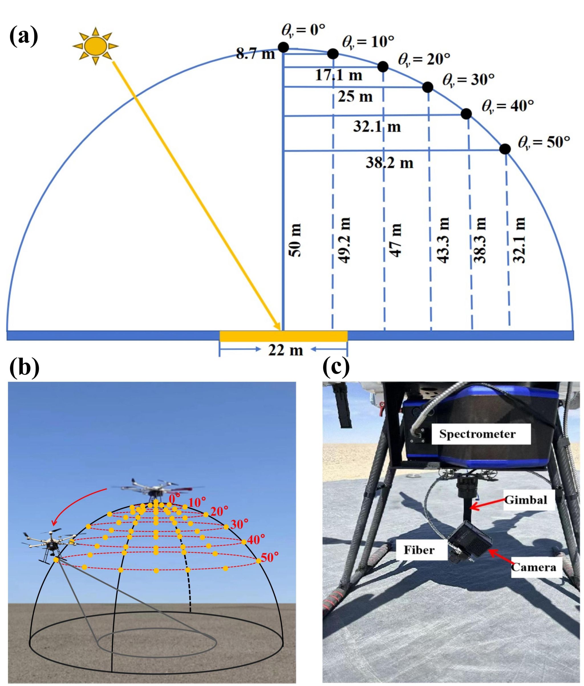 图3 (a) 无人机飞行计划;(b) BRDF测量角度;(c) 无人机系统组件