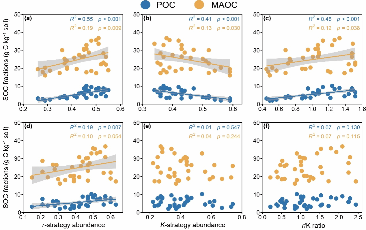 图 3 颗粒态有机碳和矿物结合态有机碳与细菌和真菌r/K策略特征的关系