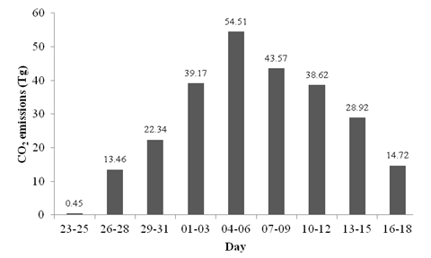 通过计算我们得出2010年夏季俄罗斯森林火灾(7月23日到8月18日)CO2排放量为255.76Tg。每三天的CO2排放量见图2.