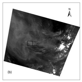 图1. 以2010年8月8日500米空间分辨率的GOSAT CAI数据为例对火灾的烟雾范围进行识别。(a)CAI 影像431波段组合,(b)CAI 波段1影像,(c)利用波段1阈值法对烟雾范围进行识别,(d)感兴趣区域(ROI)剪切后的烟雾范围,不同颜色代表不同的烟雾浓度。