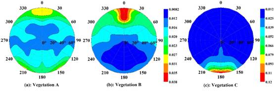 通过研究表明,植被偏振反射比可以用来计算镜面反射部分,将这部分镜面反射部分从总反射中减去,那么现有的双向反射模型可以以更高的精度来模拟漫反射部分。这种提升对镜面反射为主的植被覆被具有明显的效果。因此,这也为未来的研究提供了一个参考,即,把偏振反射比当成一种“噪声”排出来提升植被遥感模型的精度,可以将BRF模型计算误差从原来的30%(图2)减少到20%(图3),从而使模型在可见光波段有效的计算植被反射信息。